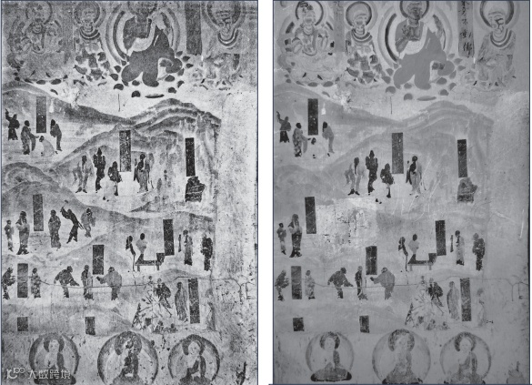 圖 | 敦煌莫高窟第323窟東壁北側,被華爾納破壞前的完整壁畫(左)、破壞後的壁畫
