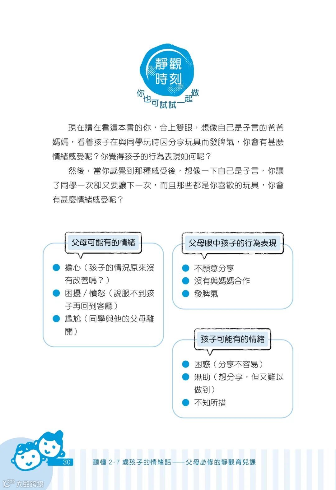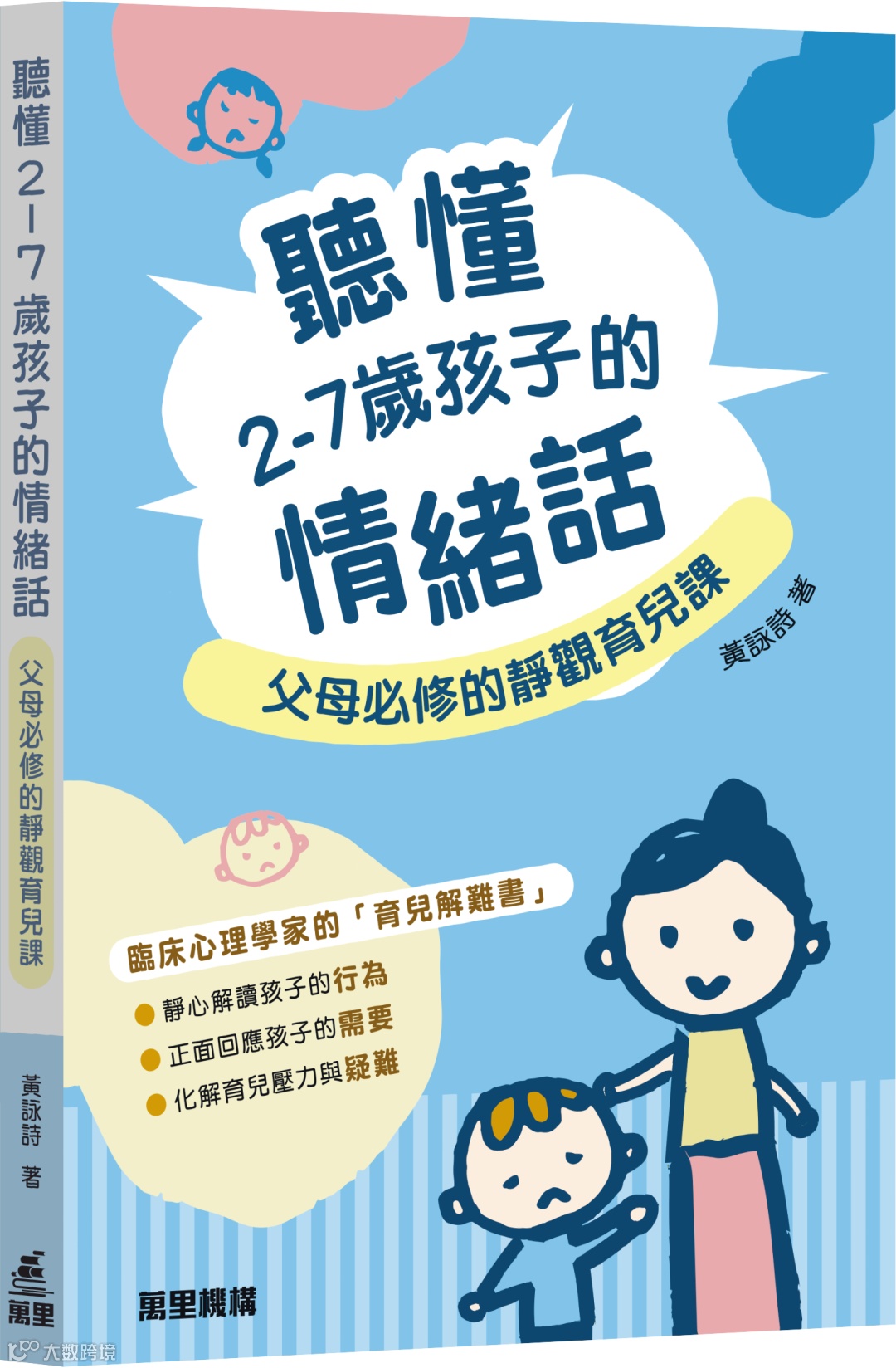 由萬里機構出版的《聽懂2-7歲孩子的情緒話——父母必修的靜觀育兒課》以「靜觀育兒」(mindfulparenting)的角度了解不同的常見育兒挑戰情況,讓父母嘗試以非批判性的方式感受自己和孩子的感受、困難與需要,並在遇到育兒挑戰時應用「正面解難」與「心態轉換」的技巧,把「反應」轉換成「回應」,讓父母掌握更有效解決育兒難題的方法與態度,不再責罵、威嚇和教訓孩子,在「危急」中也能正面化解孩子的負面行為和情緒。