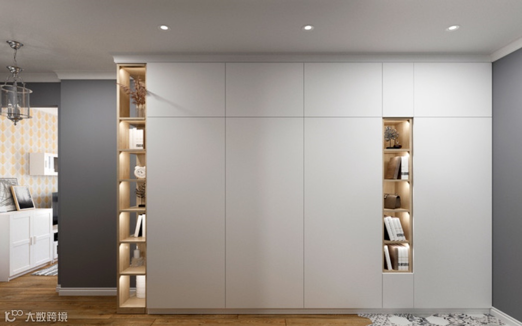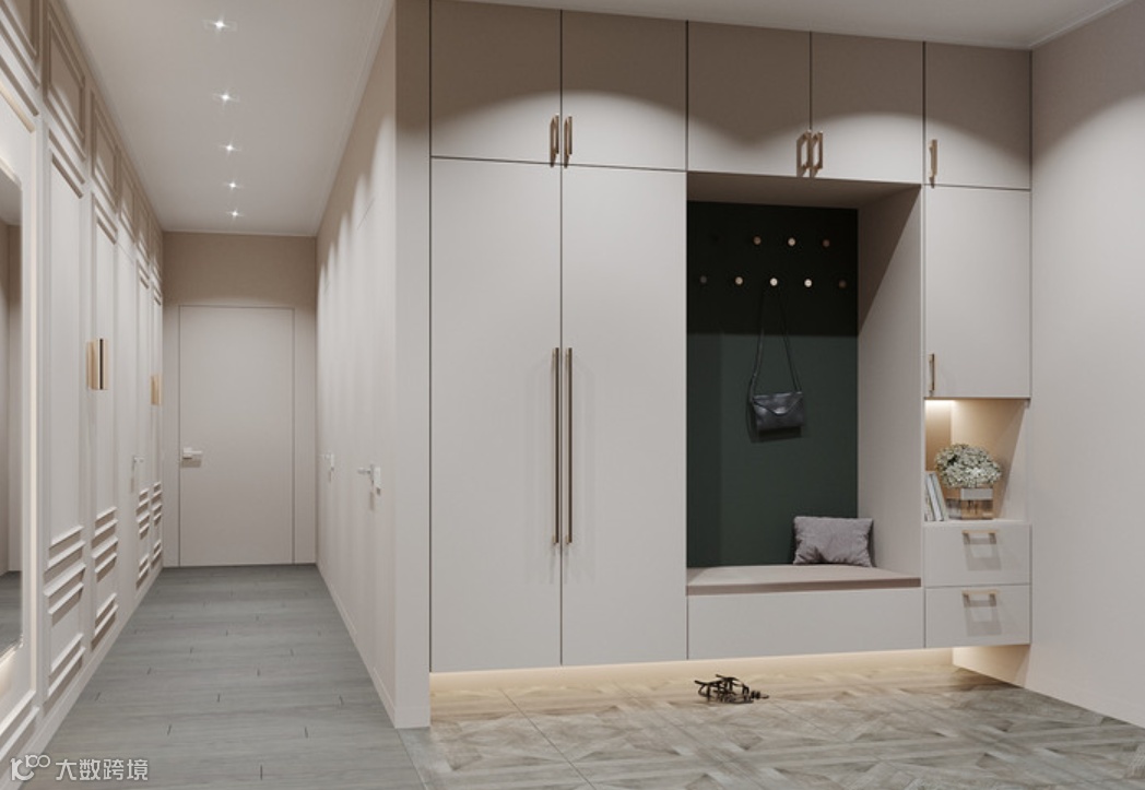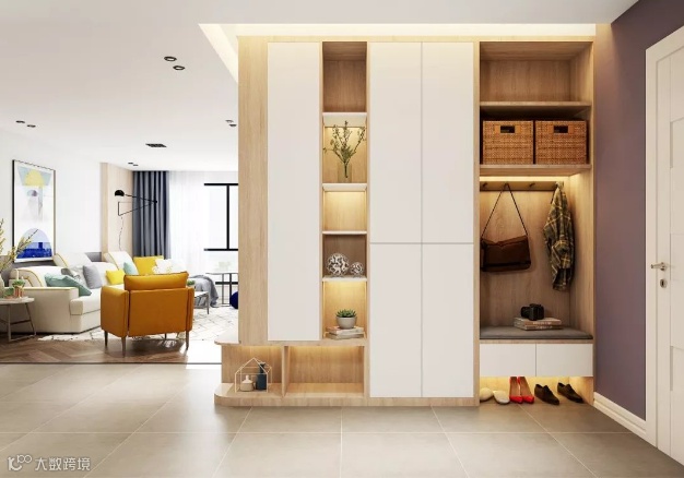 一般玄关为了方便进出门时小物品的摆放,都会选择安装玄关柜,其实我们可以充分的把这块区域给利用起来,衣柜内部可以挂上大衣、不经常使用到的上层空间也可以用来叠放棉被,衣柜的下层空间可以充当鞋柜,减轻室内空间的存储压力。