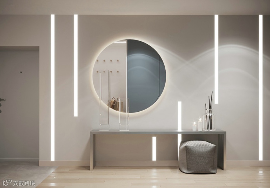 2、墙体的一侧采用镜面进行装饰,通过镜子的反射成像原理,形成视觉上的错觉,感觉空间增加了一倍;从而增加玄关的开阔性,减少玄关通道狭窄的感觉。