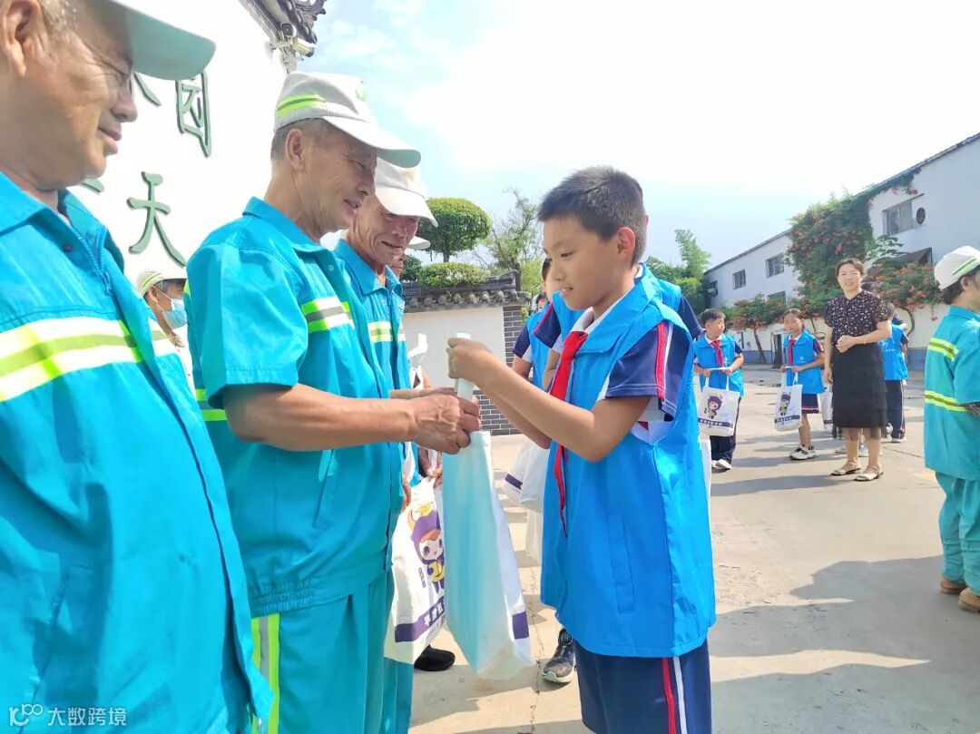 慰问现场,志愿者们将精心准备的藿香正气水、毛巾、扇子、西瓜、矿泉水、水杯等慰问品赠送给一线环卫工人,来表达自己对环卫工作、城市美容师的敬意。“这些小礼物很用心,对我们来说很实用也很喜欢,今天活动让我们很感动,谢谢双语学校这些孩子们”环卫师傅们纷纷表示。