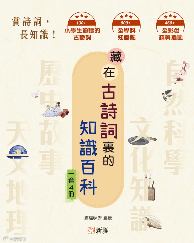 新雅文化出版的《藏在古詩詞裏的知識百科》系列按古詩詞內含的季節元素,分為春天篇、夏天篇、秋天篇和冬天篇。除了讓孩子認識和欣賞古詩詞,本系列還特設「古詩詞中的百科」,從不同角度拆解跟古詩詞有關的百科知識,包括文化知識、歷史故事、天文地理、自然科學,打破傳統學科的界限,助孩子用更有趣的方法學習知識,同時更理解詩詞的意境和含義。每篇古詩詞都有漢語拼音,還設作者小檔案、注釋、譯文和賞析。