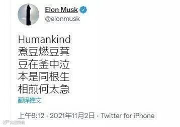 對於這首來自三國時期魏國詩人曹植的《七步詩》,推特上的網友爭論得格外熱鬧。不少外國網友求助谷歌翻譯,在納悶豆子與馬斯克有什麽關係……又一次,中文古詩詞引起了外國友人的注意。