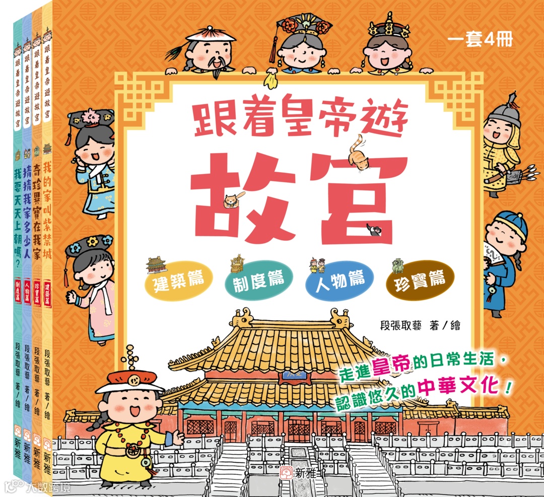 新雅文化出版的《跟着皇帝遊故宮》系列以清代乾隆皇帝為主角,由他向小讀者介紹他的家——紫禁城(故宮)。每冊圍繞不同主題,包括故宮裏的建築物、皇帝的工作及當時的制度、宮裏居住的人們和各式各樣的珍寶。通過輕鬆有趣的圖文,將故宮的面貌和皇帝的生活呈現眼前,加深孩子對歷史和文化的了解,為日後學習打下良好的基礎。
