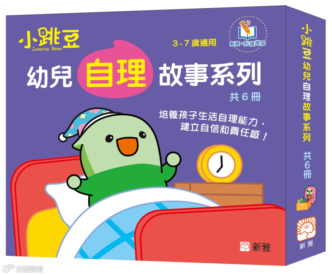 《小跳豆幼兒自理故事系列》共6冊,由跳跳豆和糖糖豆透過貼近生活的圖畫故事,帶領孩子一起學習自己進食、刷牙、上廁所、收拾玩具,並養成良好的作息和主動做功課的習慣,提高孩子對各種自理能力的認識及實踐的動機。