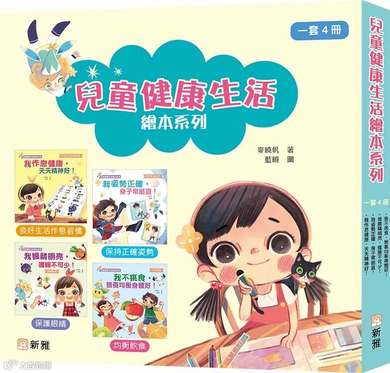 《兒童健康生活繪本系列》一套4冊,以大德德、小維維和守護小精靈貫穿故事,透過貼近孩子生活的故事,活潑有趣的圖畫,引導孩子培養健康的生活習慣,主題包括四個:良好生活作息習慣、均衡飲食、保護眼睛和保持正確姿勢。書末附有「親子遊戲」和「家長知識站」,提供相關的健康資訊供家長作為教導孩子的參考。