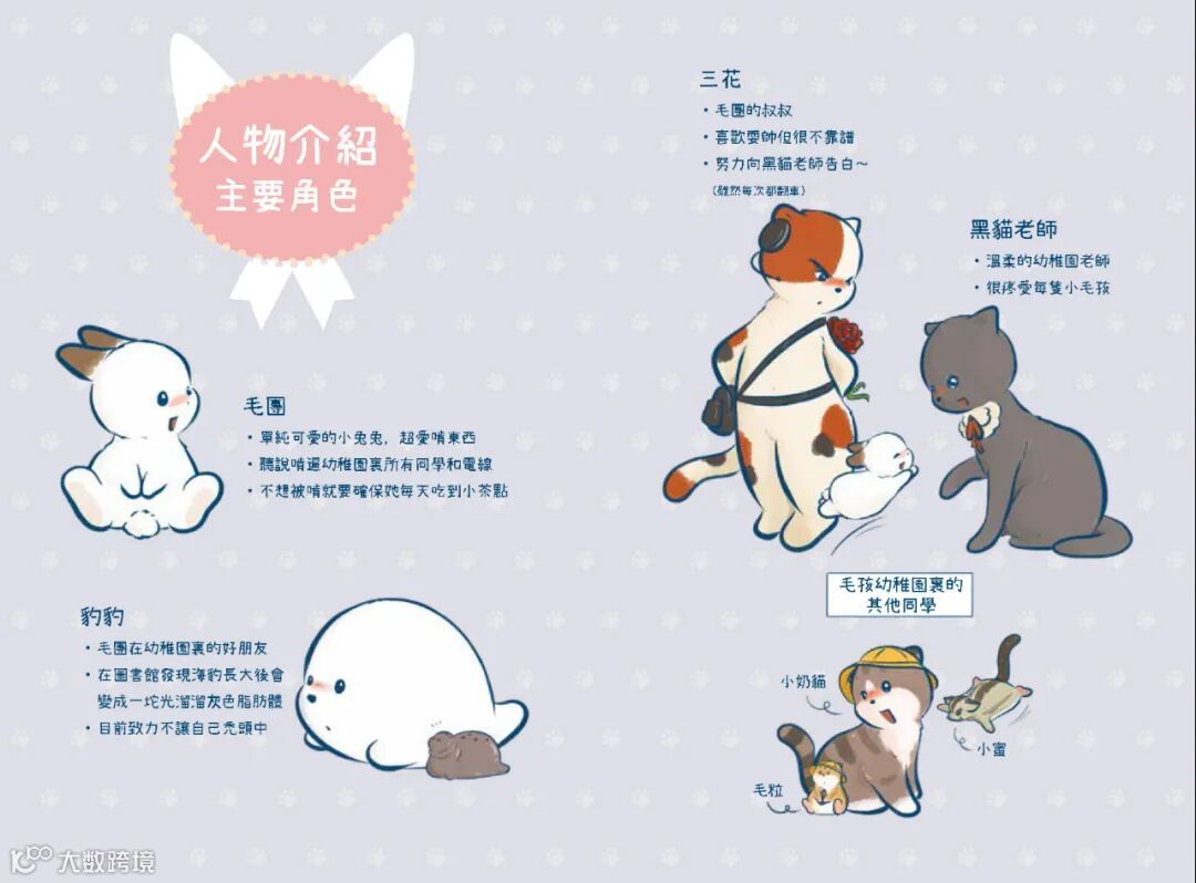 超愛啃東西的小胖兔上學去了;幼稚園內,很快跟海豹、小熊貓和花貓等毛孩扭作一團;還有經常放閃的長頸鹿學長和羊駝師妹;就連家長們也不放過撒嬌的機會。主角毛團在校園中與黑貓老師、同學小海豹、小奶貓等充滿童真、歡樂、搞笑的日常,溫暖人心。