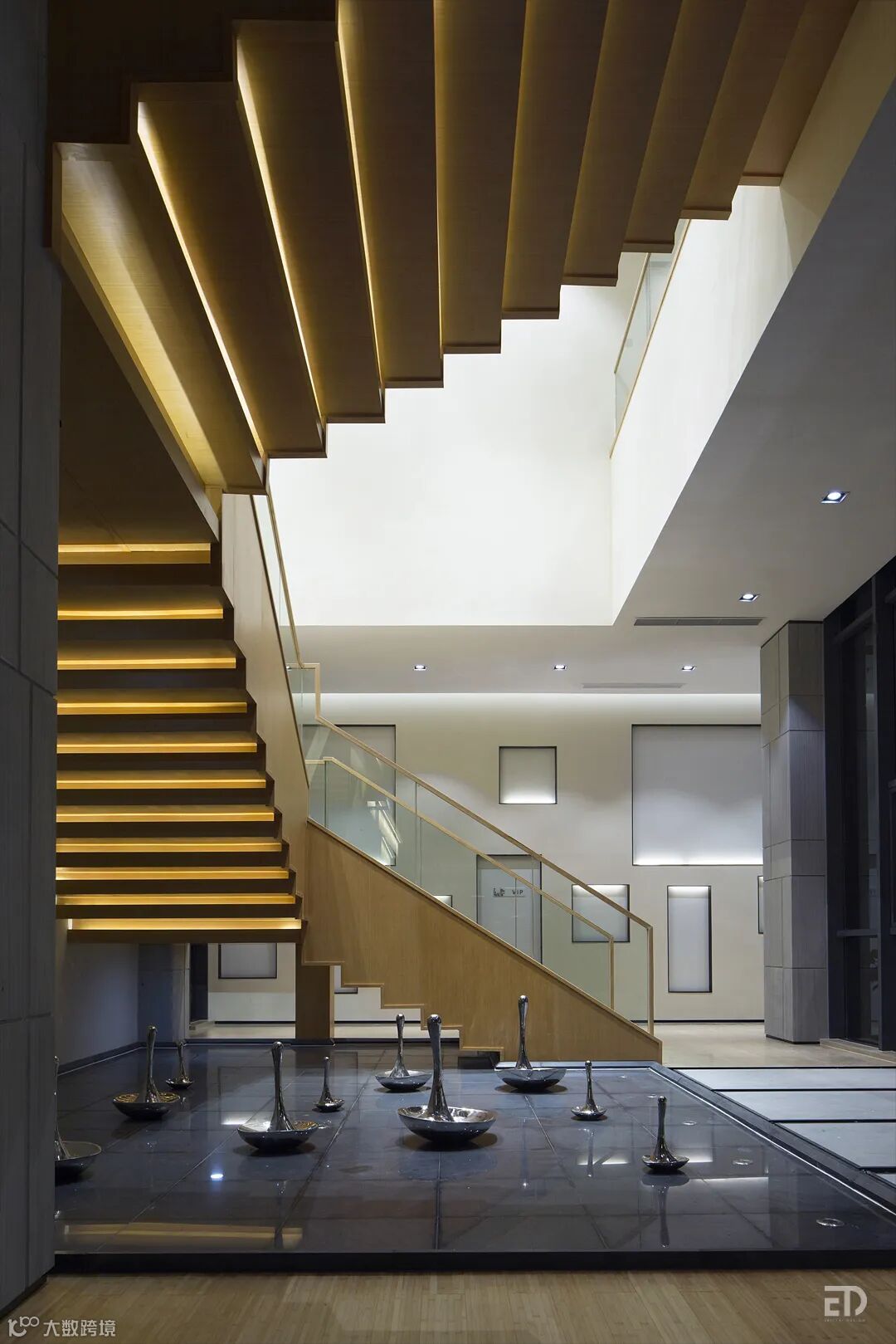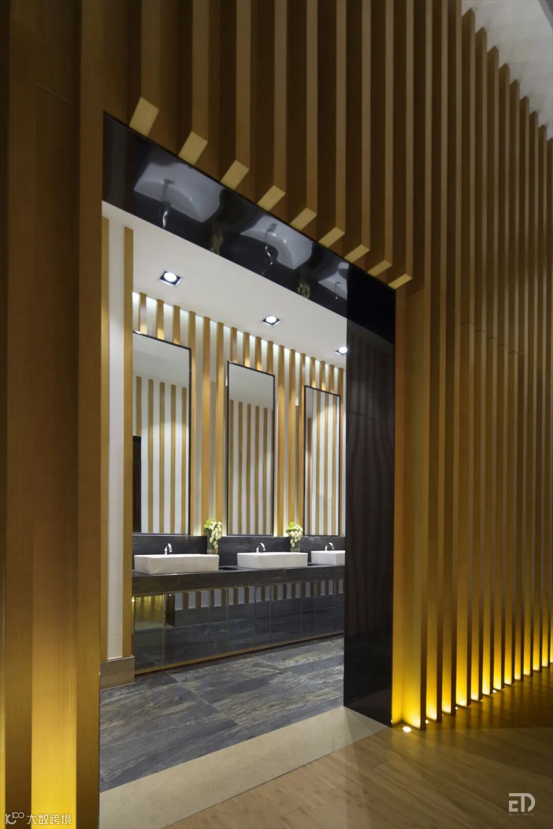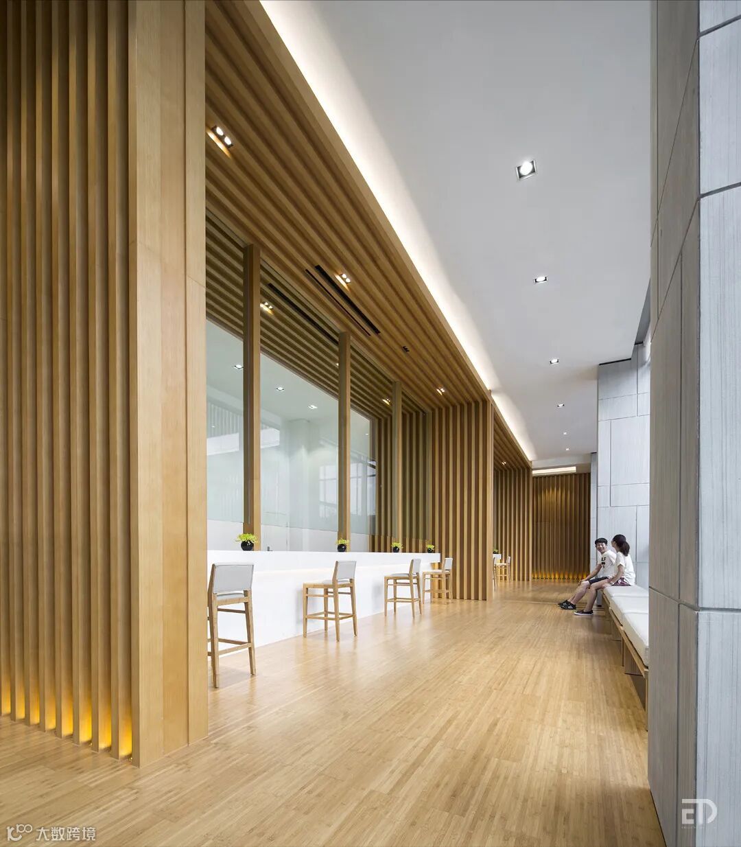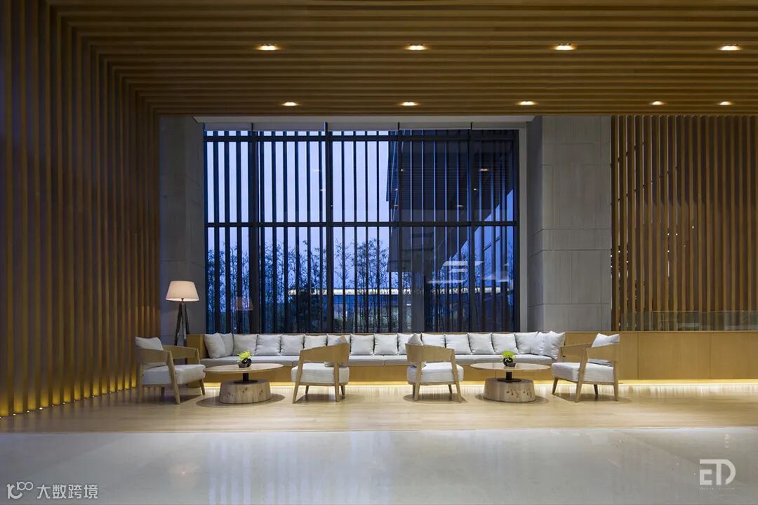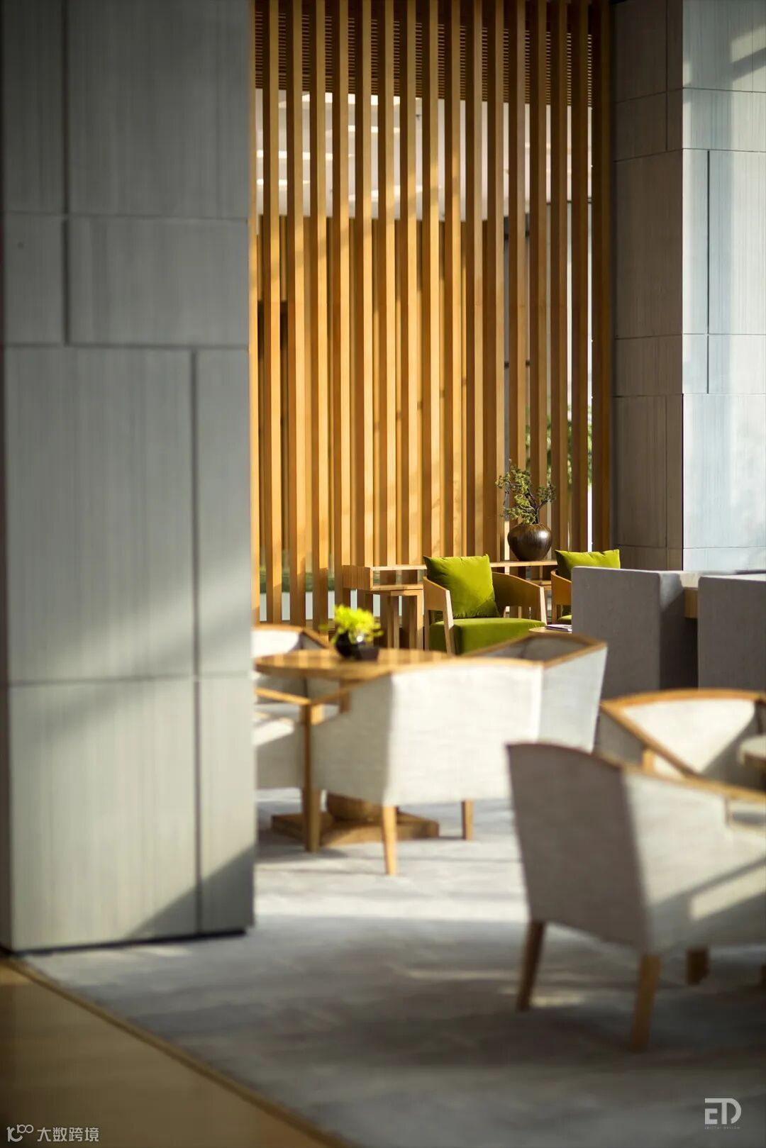 在这个直线循环的空间里,人们很容易就领会到“ 城市 • 自然 ”的设计主题。细密的直线运用了木头和钢板两种材质来表达同一种设计语言,几何造型几乎是纯粹的,同一指向正方形和长方形,反映出设计师对现代空间的自然理念:优雅的格调、方正的品质。落地玻璃窗将户外的自然风景完整引入室内,但设计师在部分透明的空间中运用了直线屏风提升了它的遮掩度,创造出一种可见与不可见、开放与含蓄、优雅与质朴、坚硬与细薄、独特与实用相互融合的城市 • 自然空间特点。同时将地域人文特色引入设计,项目所用饰面板、地板、家具皆为竹饰面,天然纹理,清新文雅。