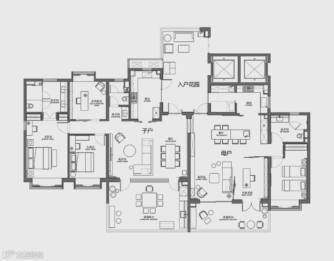 西区子母户由入户花园、子户、母户三部分组成,分而不疏的创新设计,既满足了三代人合居的需求,又让孩子与老人各自拥有相对独立的居住空间。子母户的入户花园和两个景观阳台,前后把户型围合,让人可以尽情感受与自然的近在咫尺。