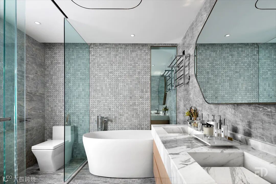 主卧洗手间全部用天然石材装饰,自然又奢华。石材马赛克背景墙进一步提升空间的经典美感。