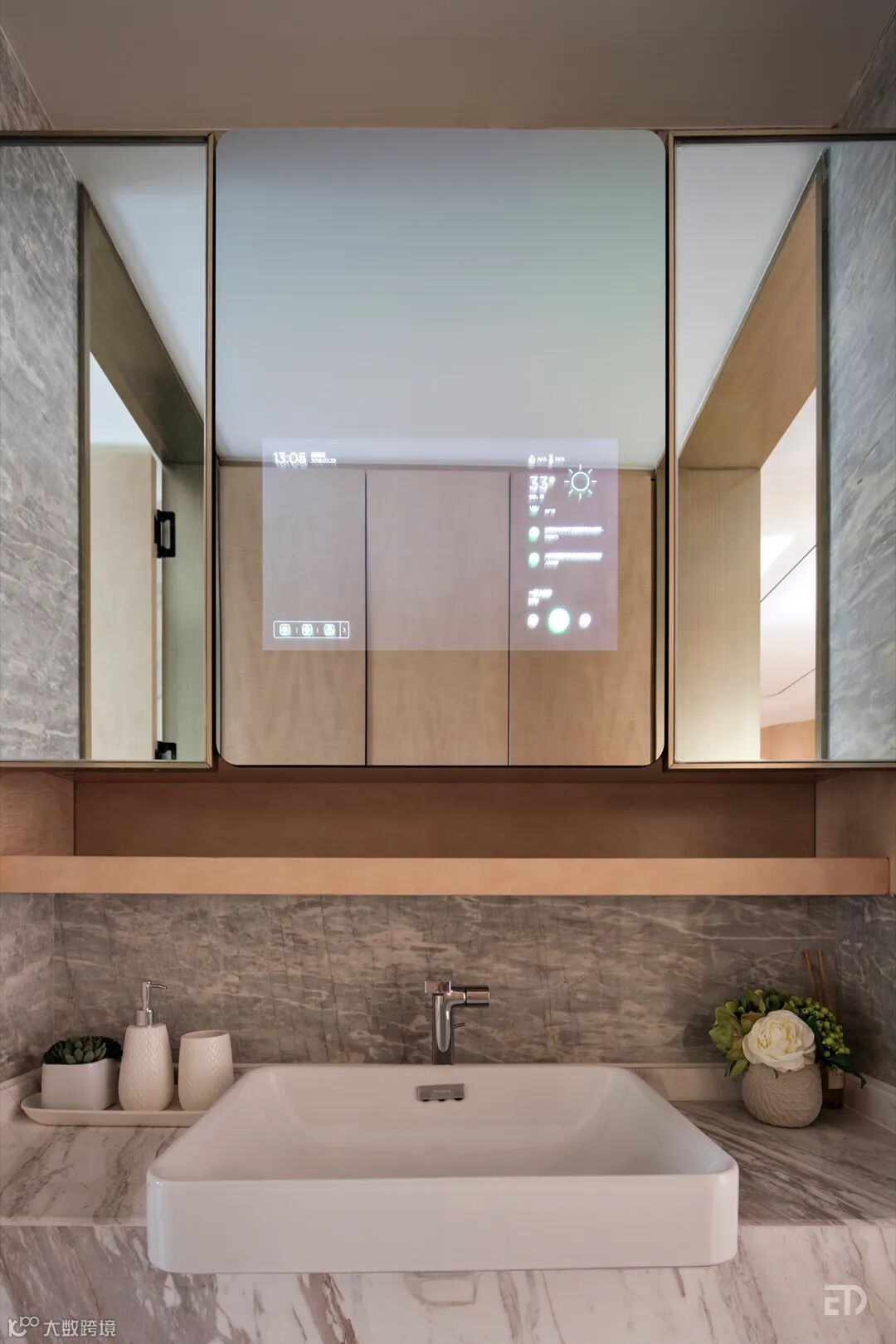 公共洗手间智能镜柜具有播放音乐、显示天气和控制灯光等功能。