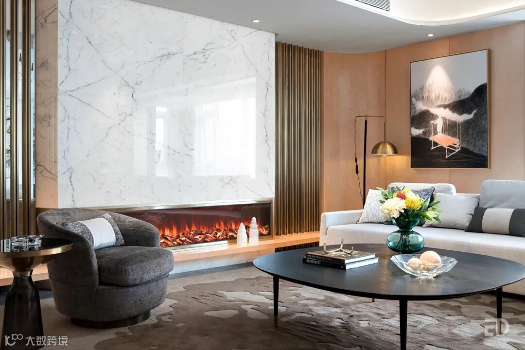 全屋木饰面采用加拿大枫影木,质感细腻温润,做为起承转合的背景色柔和而不张扬,大地色系作为主调将居室格调渲染得更为温暖雅致。电视背景墙用雪花白云石铺设,下嵌壁炉。地毯好似光照映射下的斑驳树荫,与挂画的抽象山形互相交融。