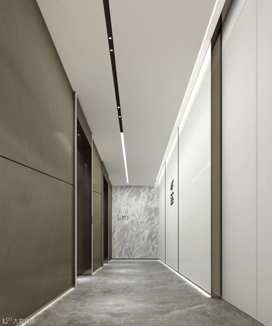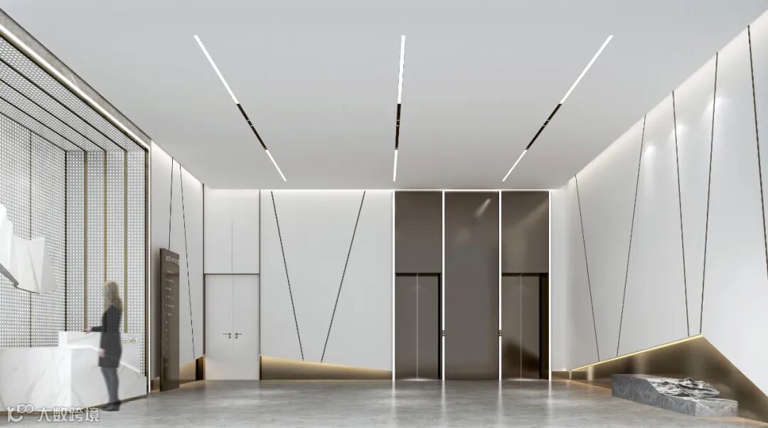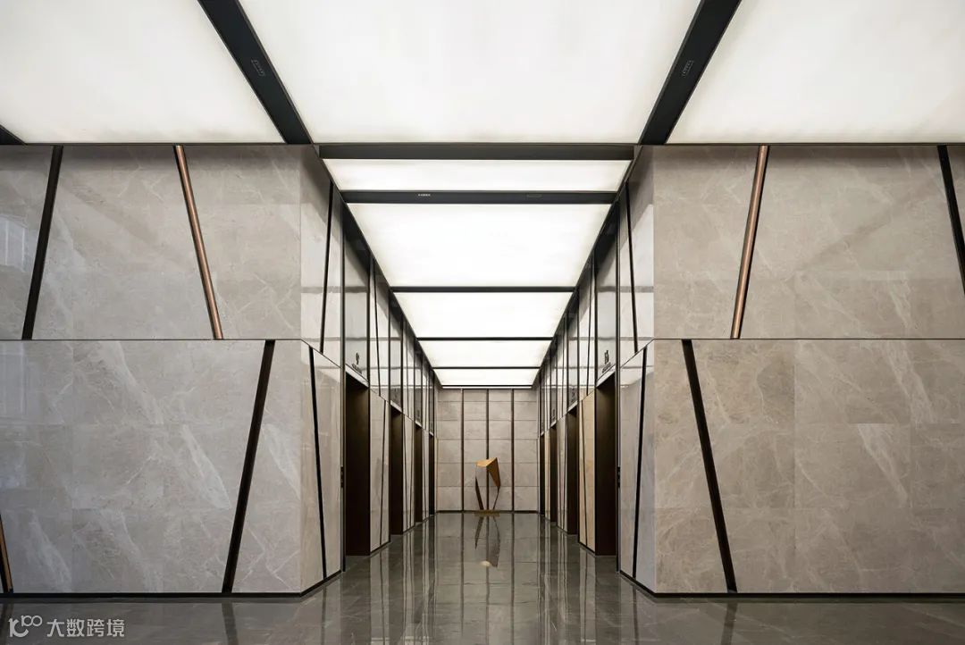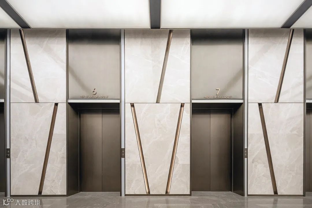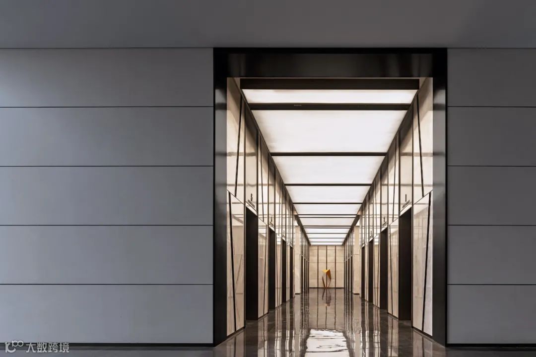 步入12米高的写字楼大堂,浅米色与浅灰色的色彩搭配给人以别样的都会视觉体验。米白色的石材墙面竖向整齐排布,把人的视线引向高处。天花木饰面胶板错落有致,灵动而有序。灰色石材地面给空间增添了沉稳气质。