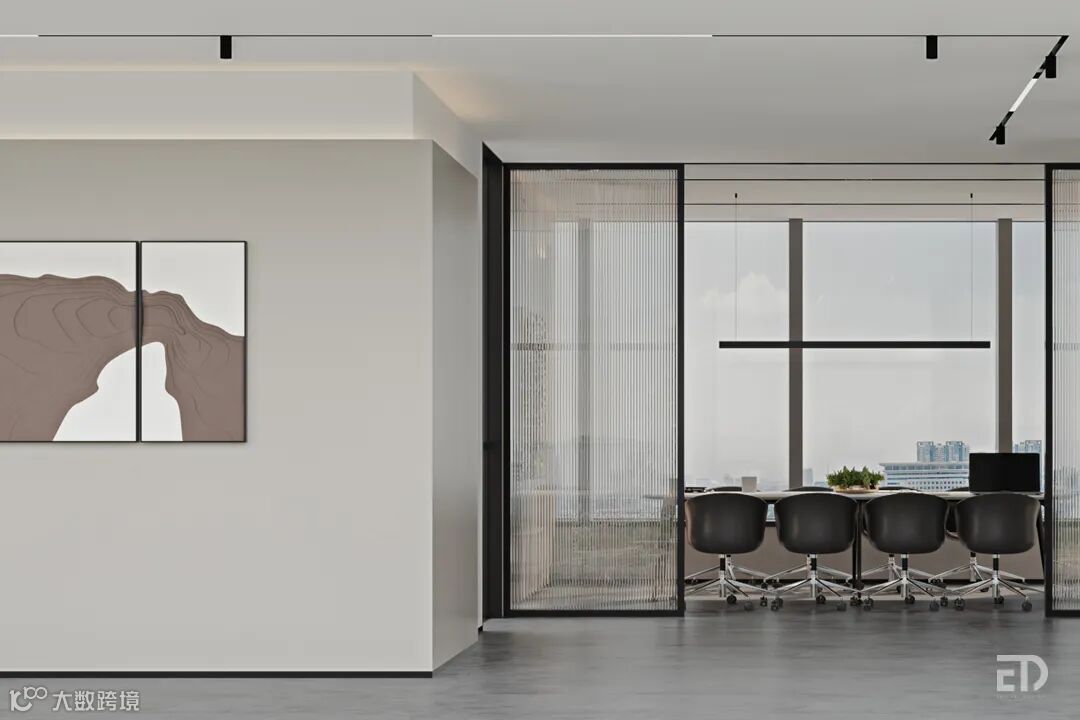 空间的形式做到了极简,没有任何多余装饰,竖向木格栅、乳胶漆墙、条纹玻璃移门、简单的天花、储藏柜及办公室的门涵盖了所有的造型。通过简单的形式,营造出通透流畅的空间,空间可以通过格栅门及玻璃门开放或密闭,满足不同的使用需求。