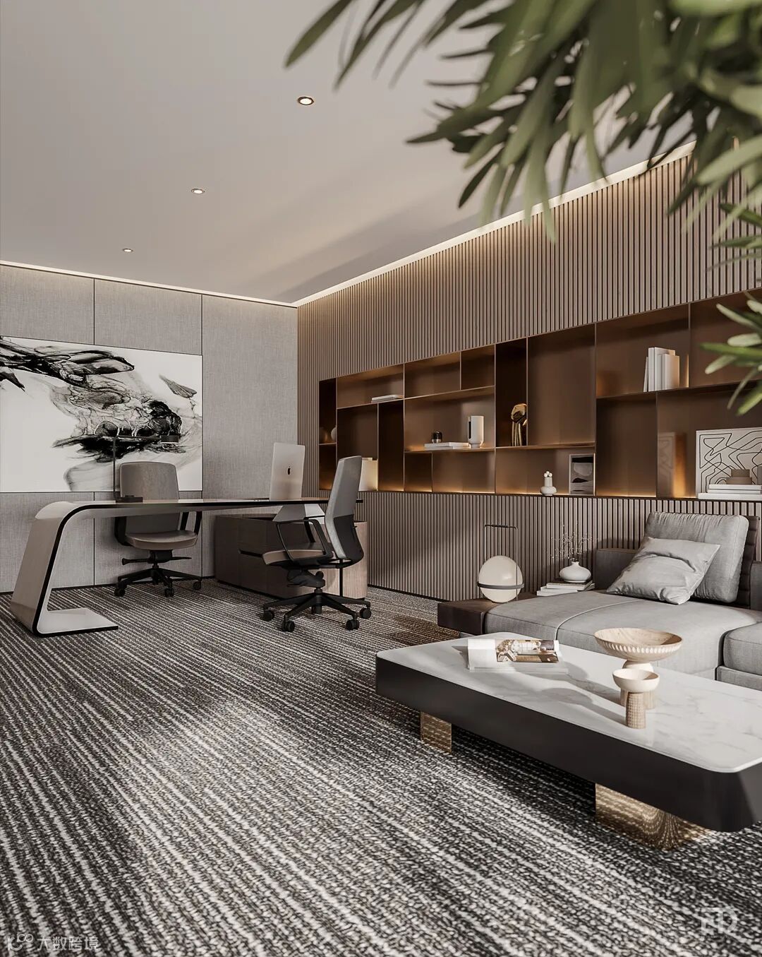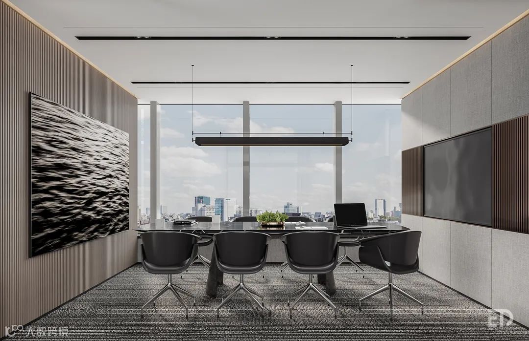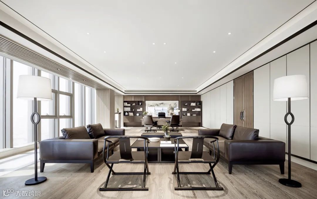 董事长办公室运用利落的线条以及丰富的层次加强视觉感受,在窗边,设计师精心创作的中国枯山水造景,泰山松石触发禅意的空间韵味,与窗外绵延山景相映成趣。室内软装陈设体现出戴勇设计团队的思考:现代简约和东方自然之美的共存。