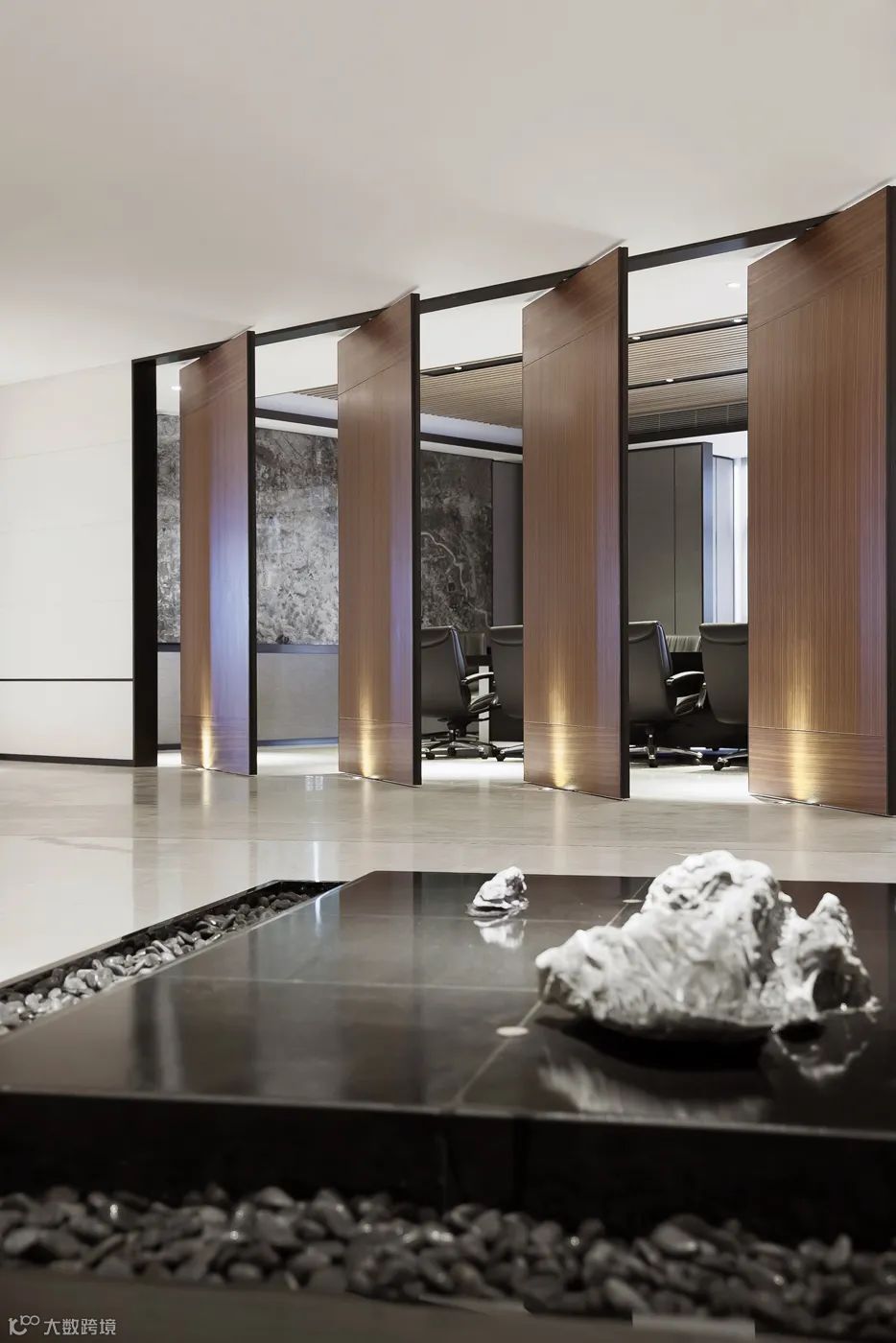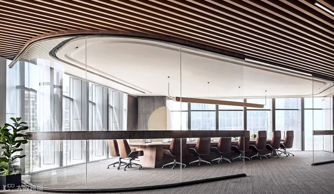 内部区域以办公功能为主,开阔敞亮,原木自然纹理与米白石材的内敛气质呈现出设计的审美倾向。经得起凝视、触摸和历练的质感,穿越时空距离,用现代设计语言解读传统,使环境和心灵都达到灵与静的唯美境界。