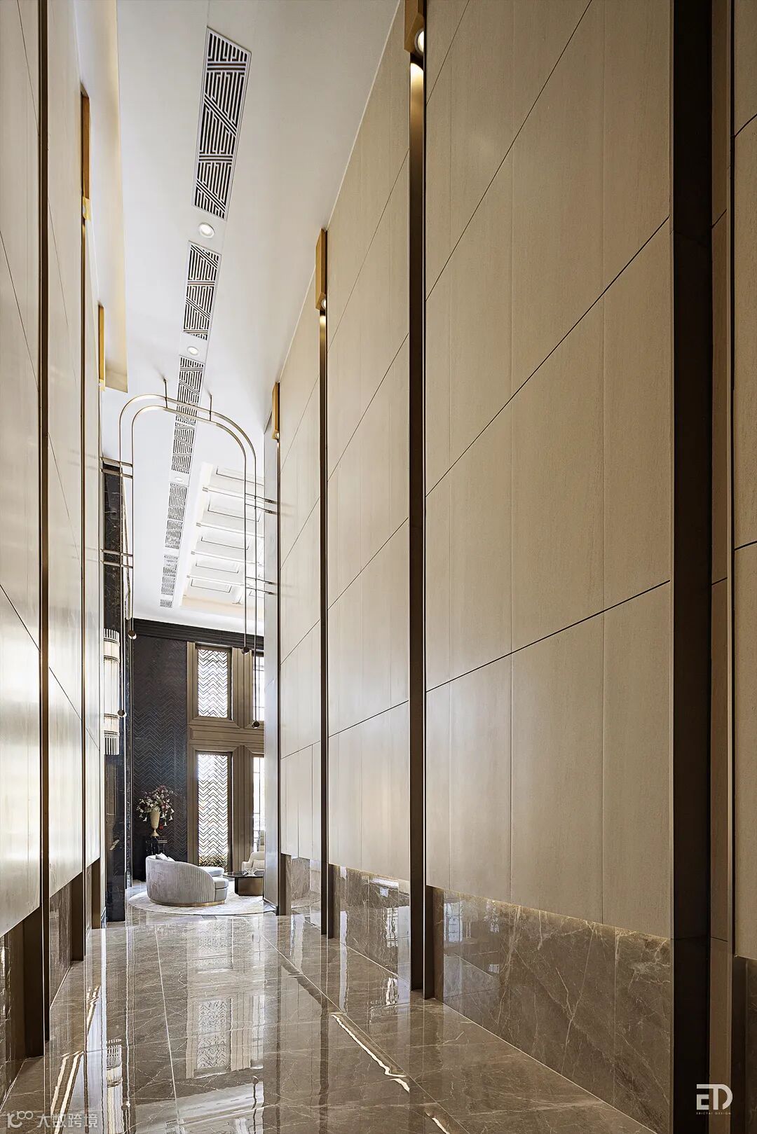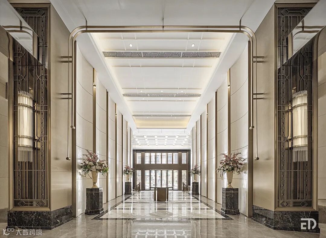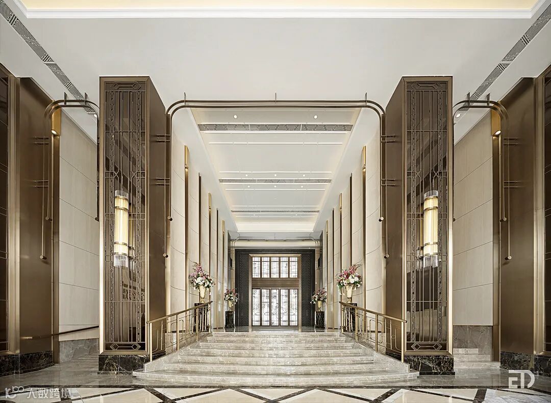 9米层高的入户大堂在米白、纯金和金黄色调的轻柔包裹下,优雅大理石和拉丝面古铜装饰,空间流露出如“巴黎沙龙”般的艺术美感。精致的空间,低调奢华中透着温暖,独特的文化气息贯穿整个归家体验。