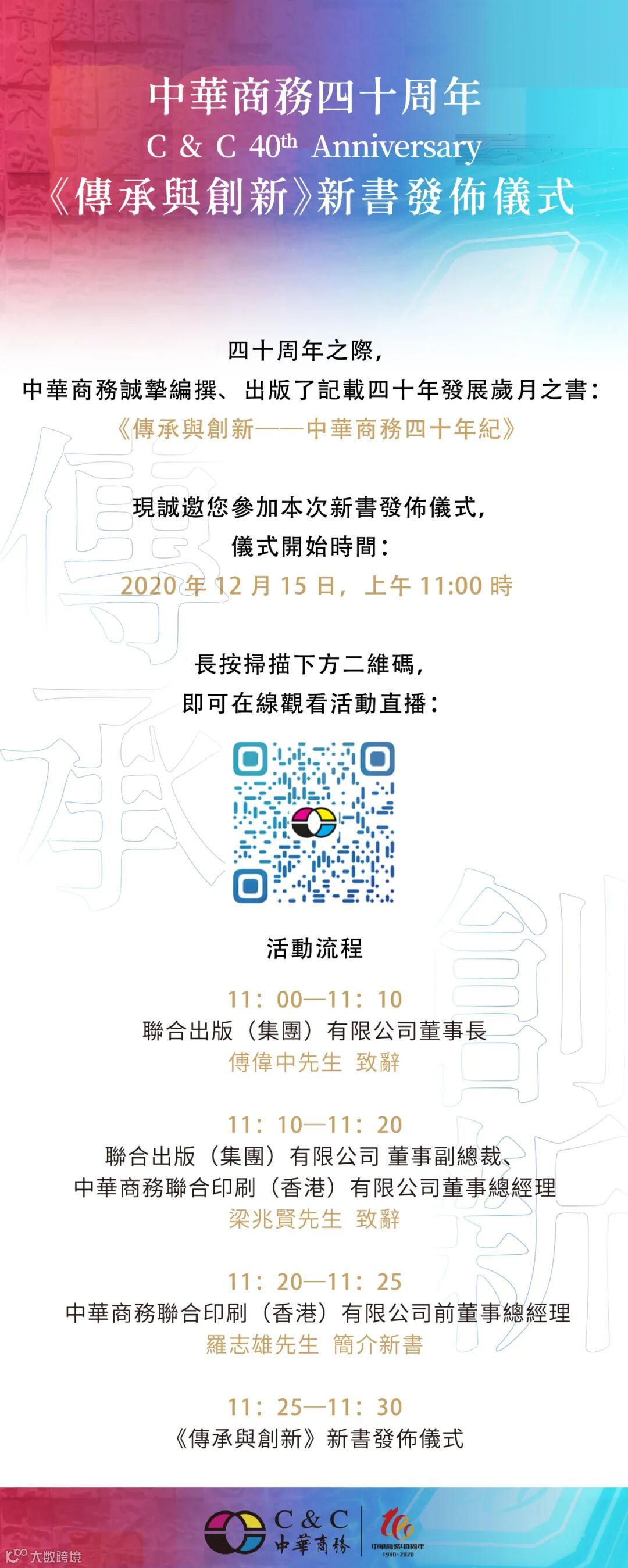 中華商務四十周年活動暨《傳承與創新》新書發佈會將在2020年12月15日上午11時於香港中華商務印刷大廈隆重舉行。屆時,聯合出版(集團)有限公司董事長傅偉中先生與聯合出版(集團)有限公司董事副總裁、中華商務聯合印刷(香港)有限公司董事總經理梁兆賢先生將會先後致辭,其後由中華商務聯合印刷(香港)有限公司前董事總經理對新書《傳承與創新——中華商務四十年紀》進行介紹,此後將會舉行新書的發佈儀式。