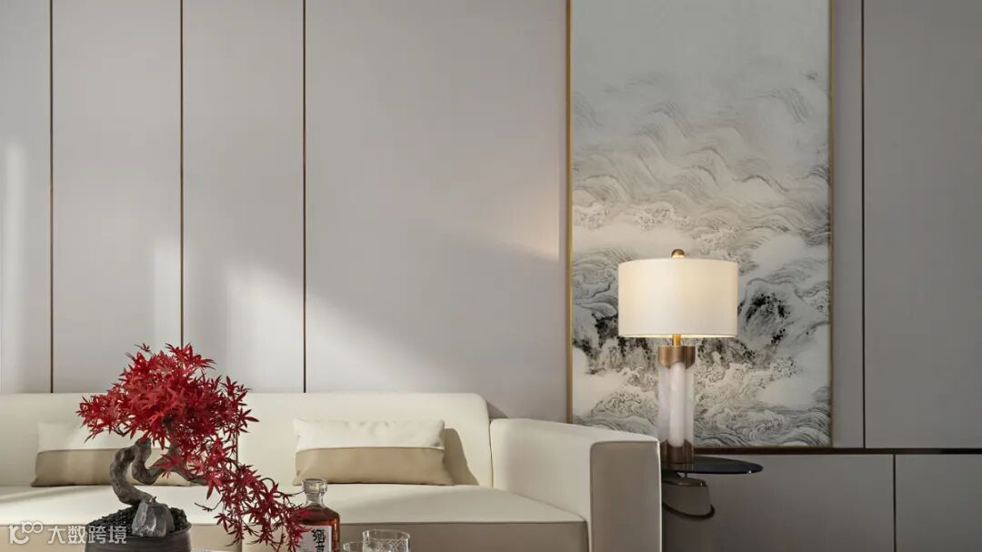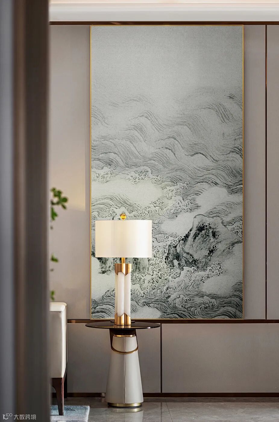 客厅线描山水画以其渐变的墨色与景物的层次感展现了中国绘画的精髓。一经山水画的置入,中式风格便被全盘烘托而出。
