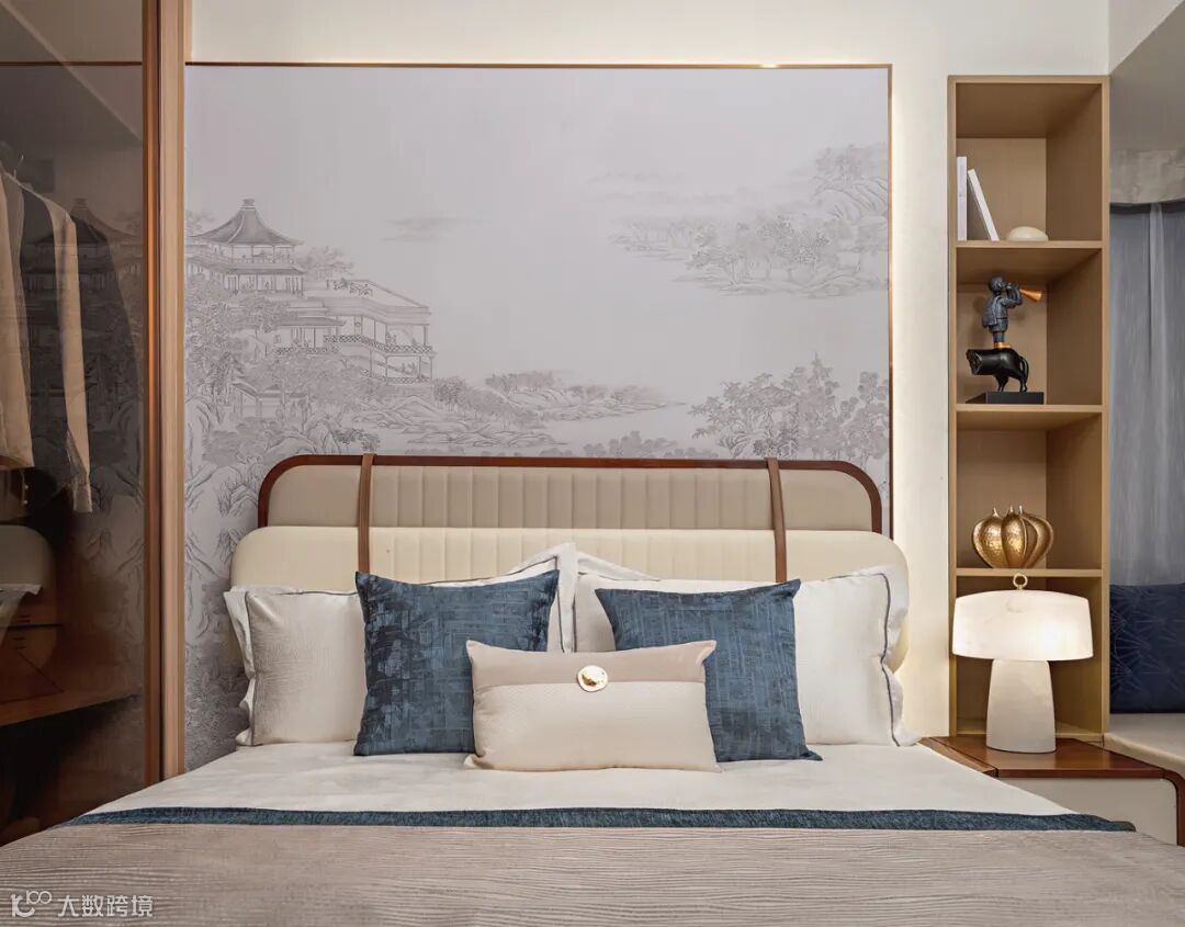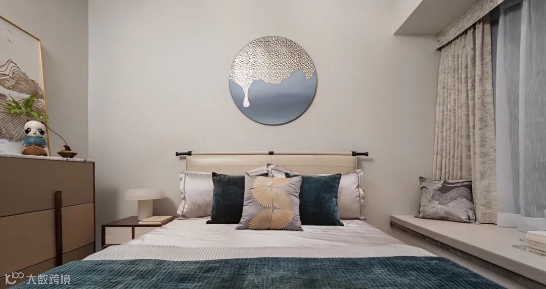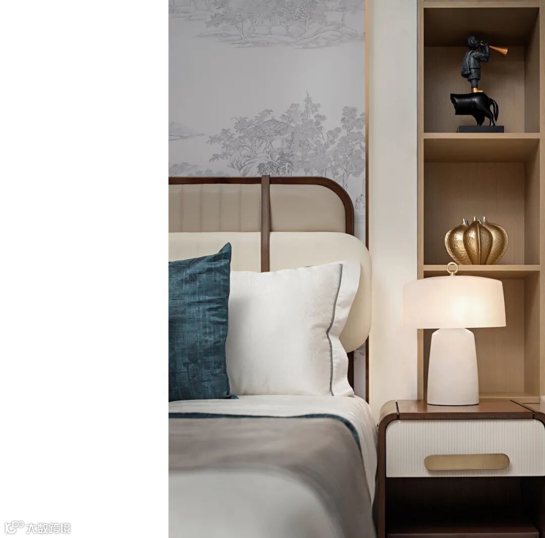 长辈房的设计,提炼了山水的意境,抽象的东方古韵弥漫一室。侧柜上的熊猫雕塑来自画家陈万毅,憨态可掬,悠然自得。