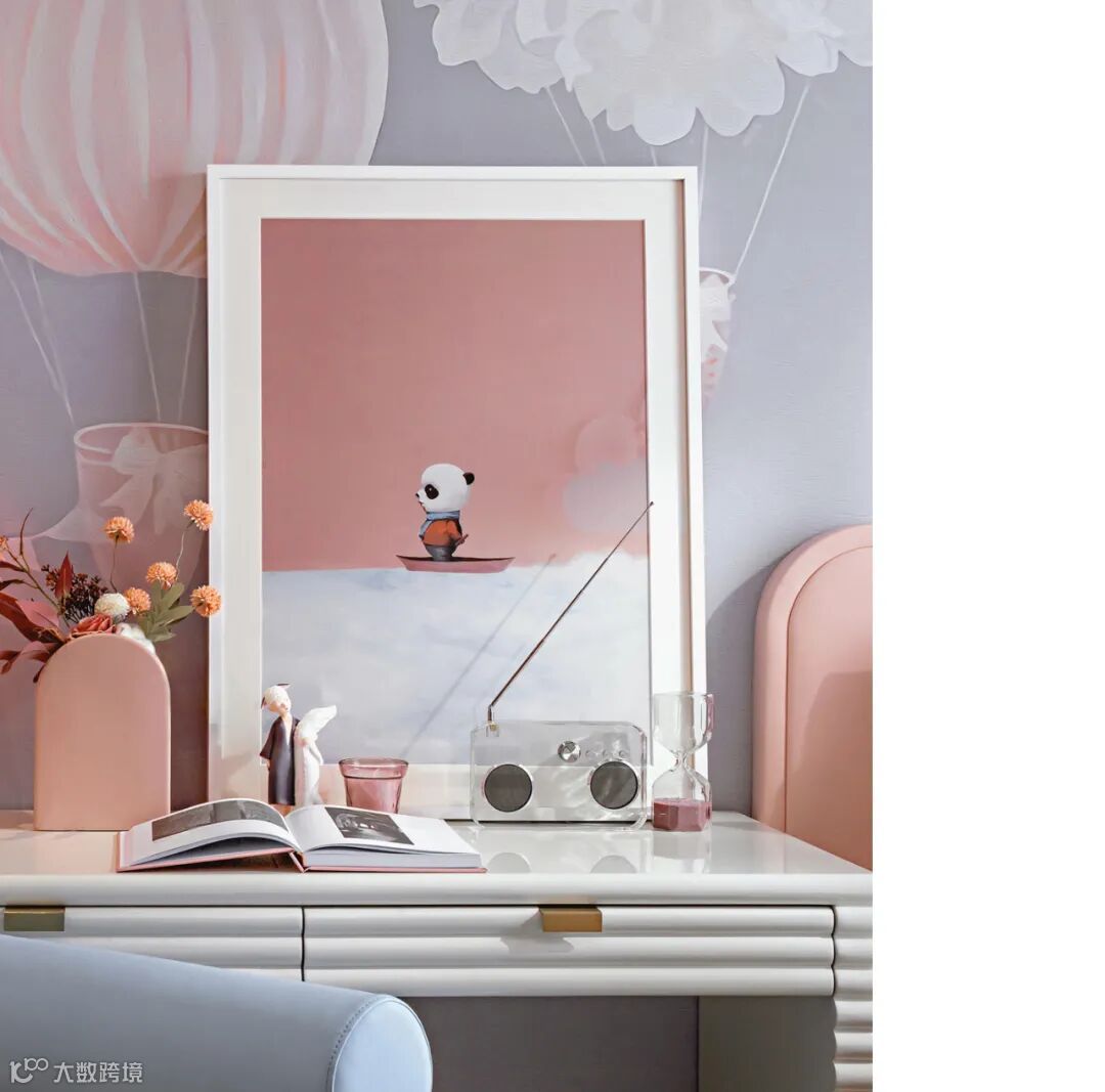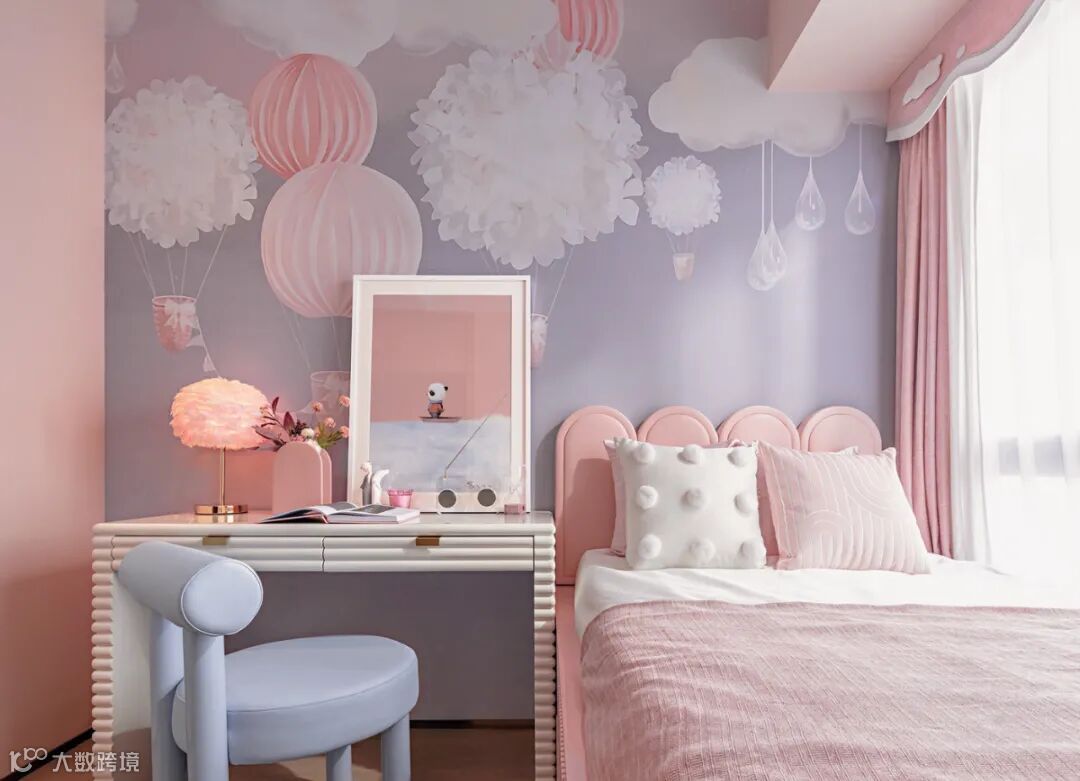 女孩房的陈设显得温馨而浪漫。空间是梦幻的,从墙纸、窗帘到靠枕、台灯,无一不是温暖的粉色。在这里,书桌也可以变成热气球,承载着孩童的梦想,缓缓飞向天空。画家陈万毅的熊猫主题艺术作品再次成为空间的主角。