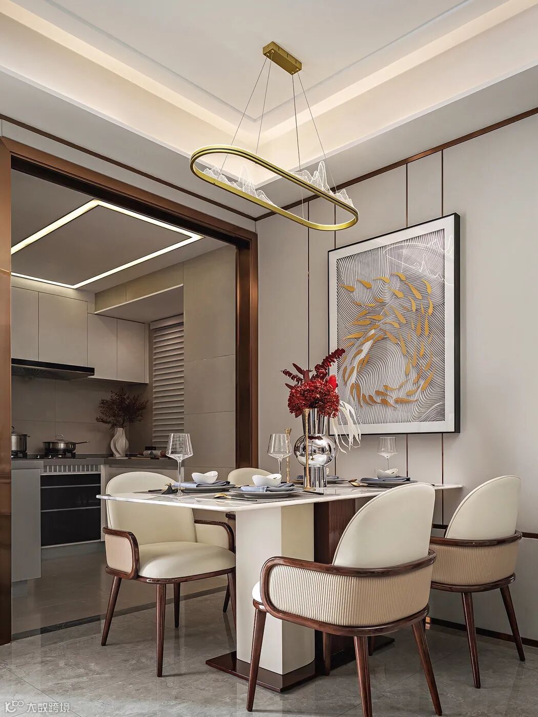 “诗以山水为境,山水亦以诗为境。”在中国的山水画中,强调意境的静谧表达,同时也格外关注物象与心境微妙的辩证关系。客餐厅呈现简约而开阔的面貌。以米白色与暖灰色为空间主调,化繁为简,在种种纷繁复杂的形态之中梳理出一条全新的路径。