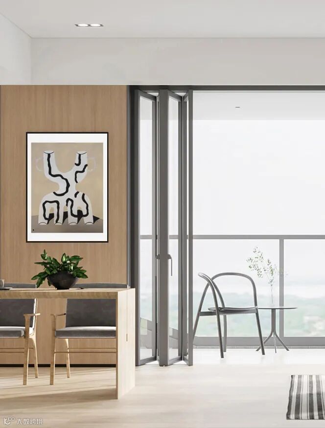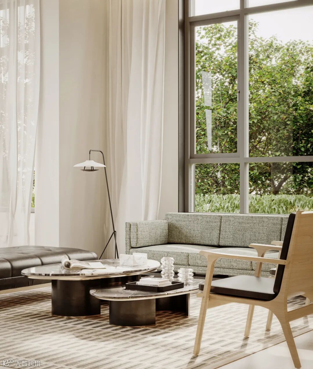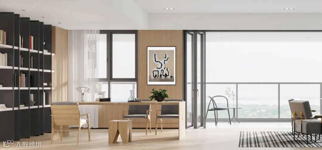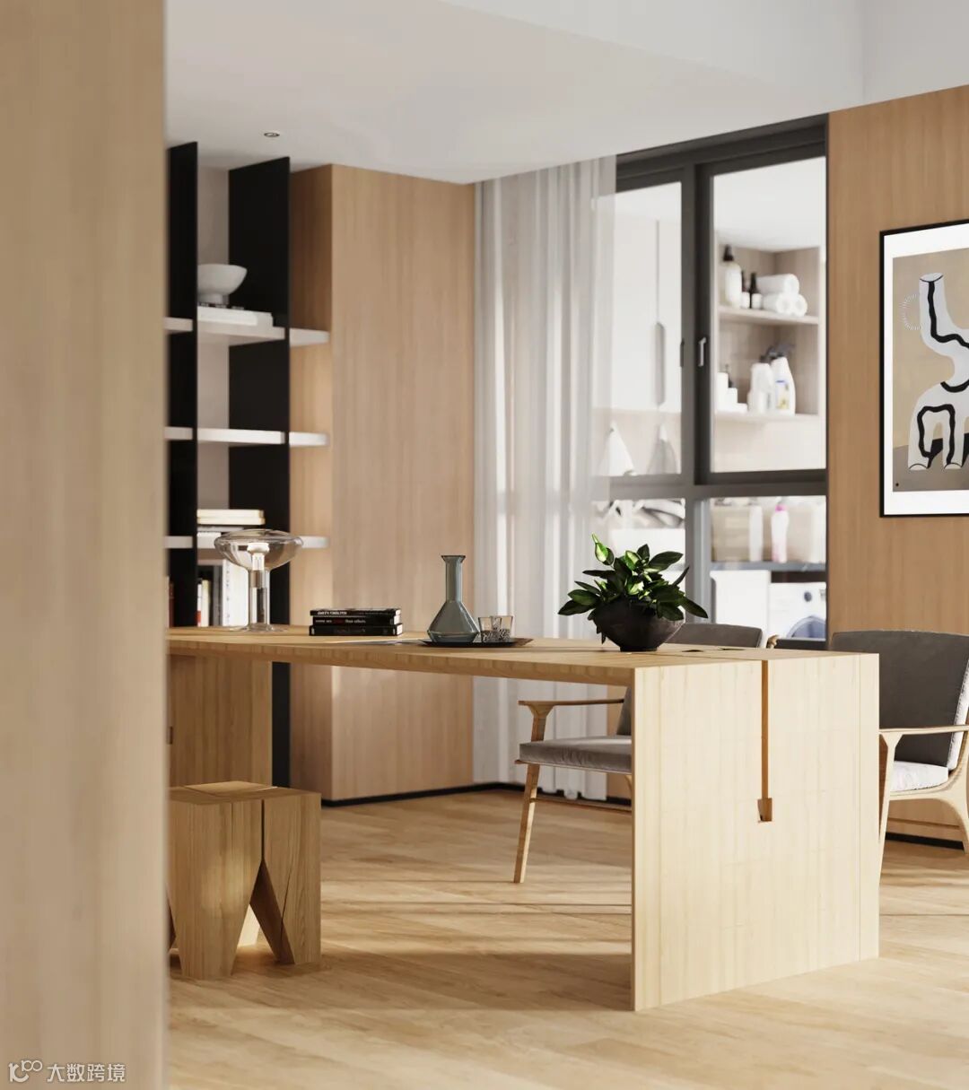 书架旁设置的学习阅读桌用自然的木材及简洁的形体打造,配合软垫书椅及实木凳;学习区的设计通过现代工业美学的表现形式,展现经典与当代的多重平衡。书椅出自丹麦建筑师、设计师Space Copenhagen的设计。阳台椅出自建筑师、设计师Neri&Hu的设计。