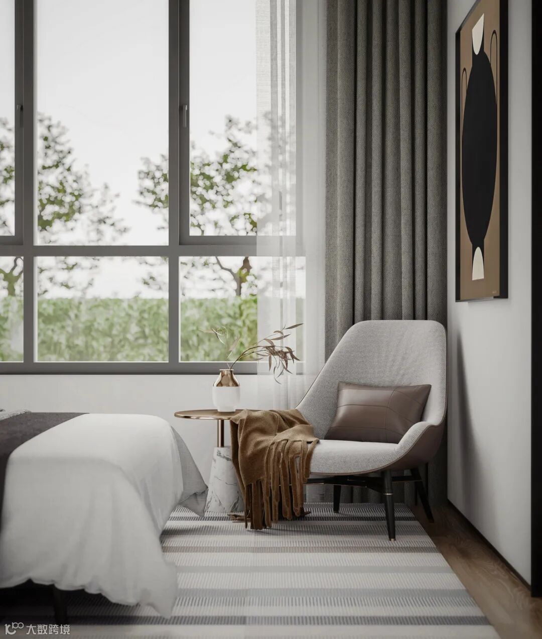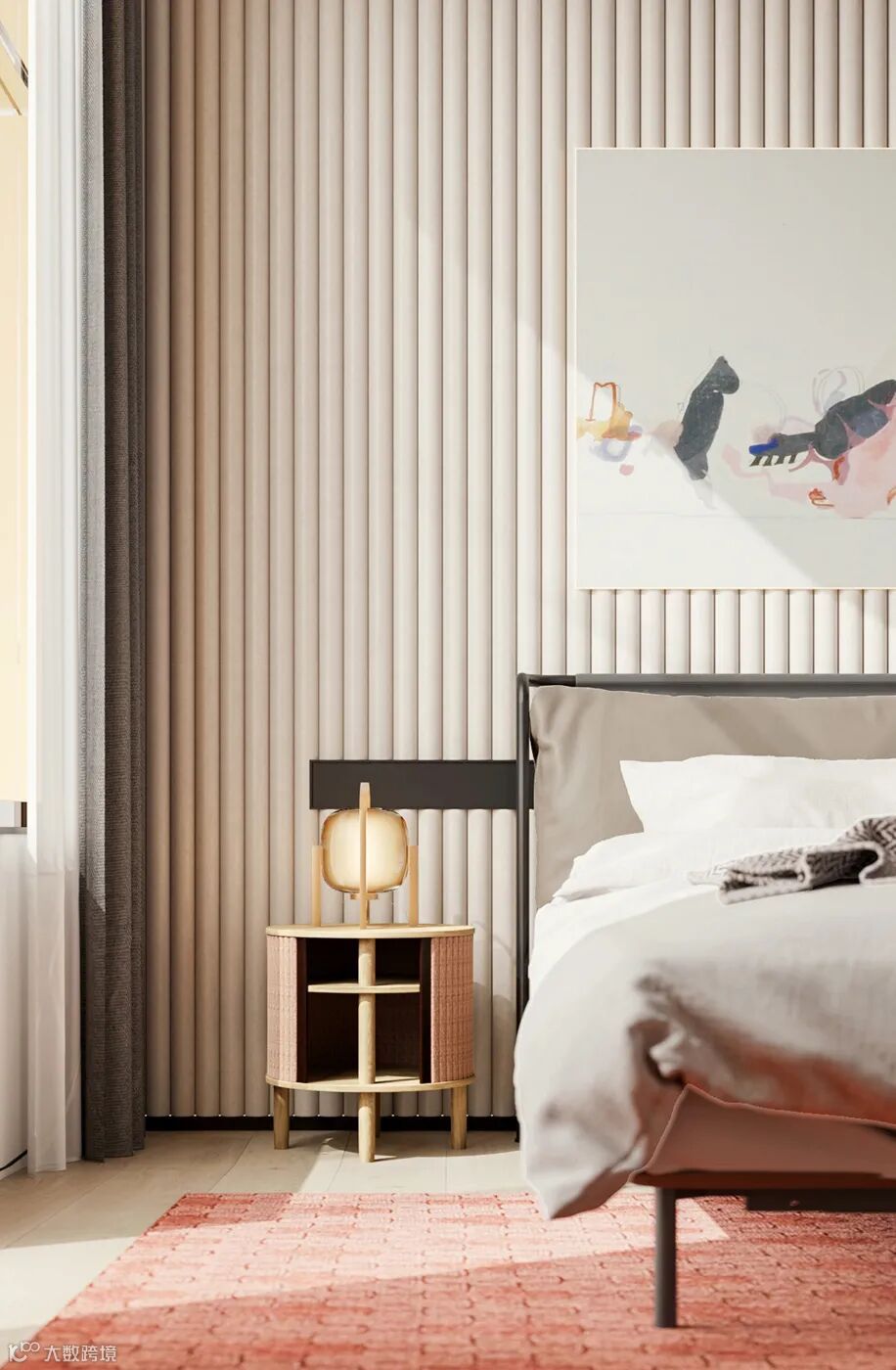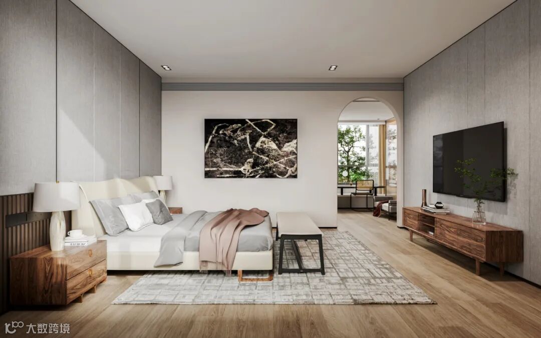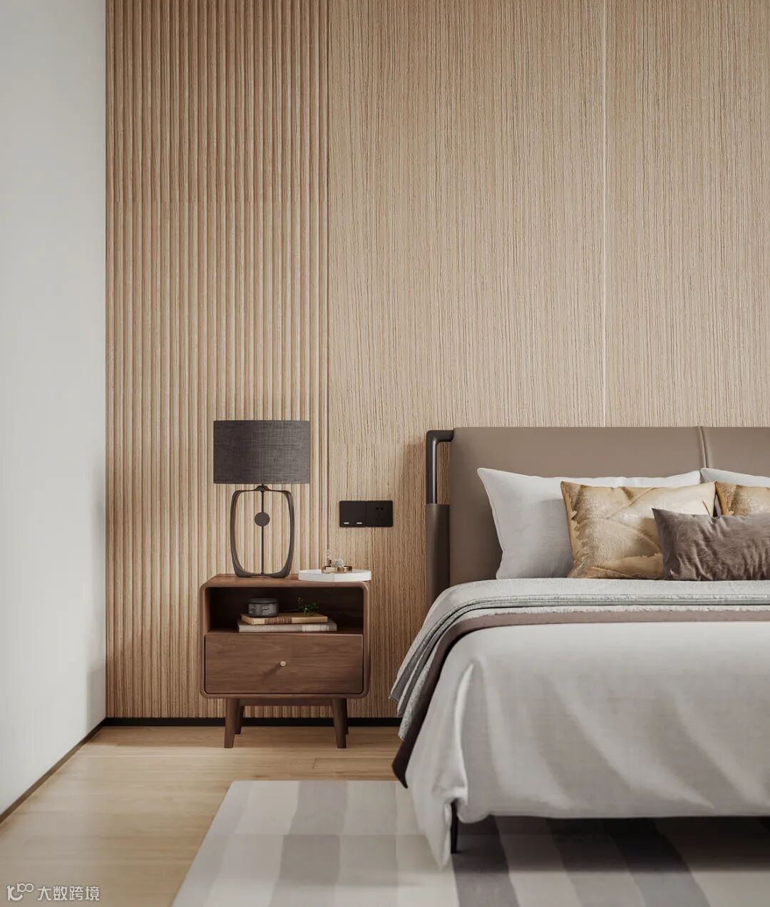 长辈房以木饰面和灰啡色皮革为主要色质,营造自然并具质感的空间。