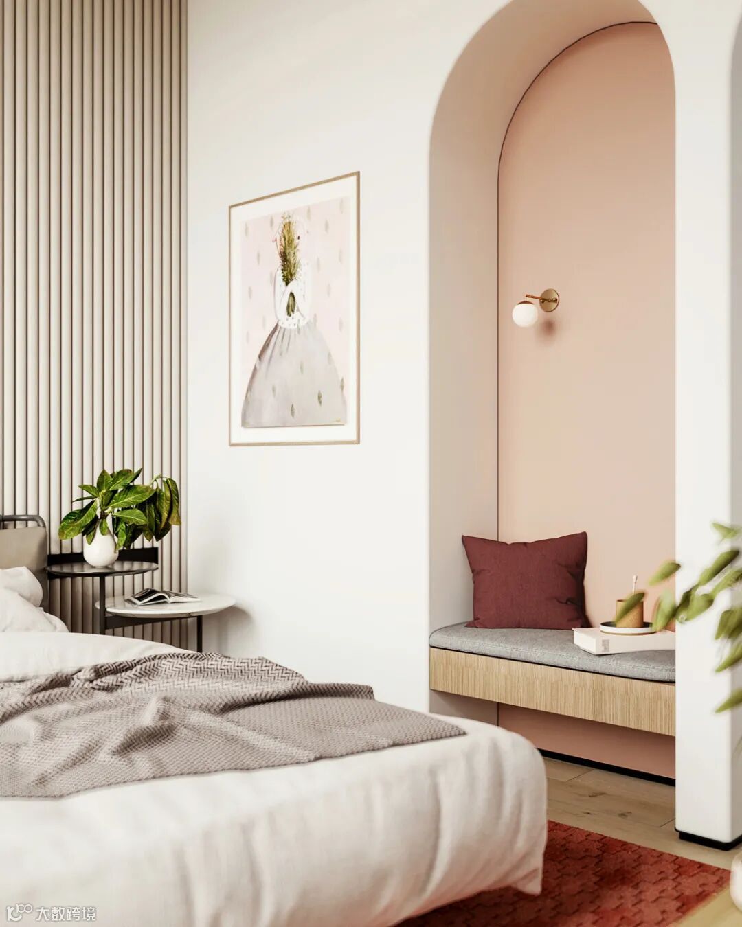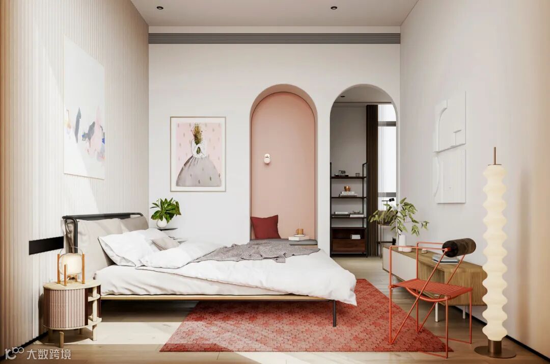 女孩房以米白色为主调,点缀红色及粉色。形态多样的软装给空间带来轻盈、活泼的氛围,让人耳目一新。