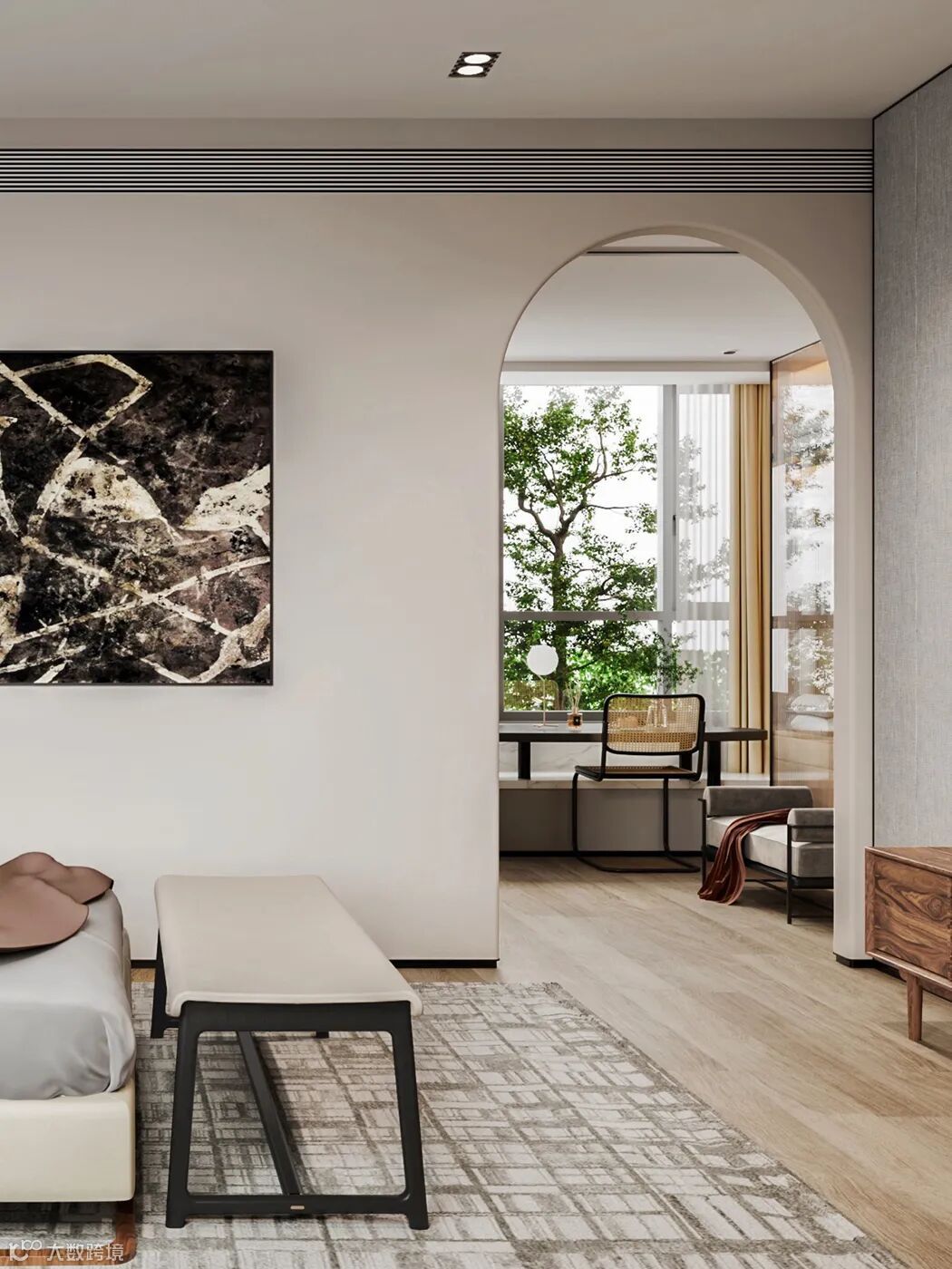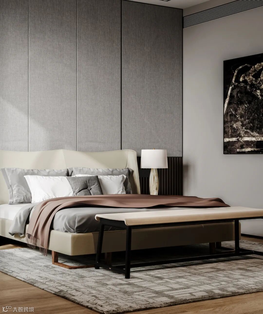 主人房呈现简洁沉稳的格调,米色的皮革和天然胡桃木材质适合家庭舒适、温馨的情感需求。床尾凳出自建筑师、设计师Neri&Hu的设计。