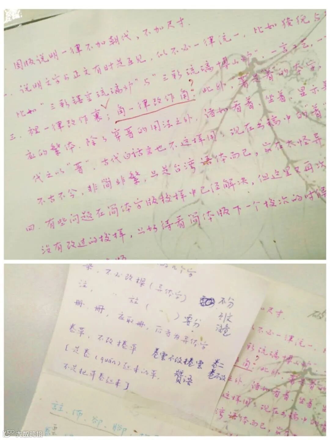 在多年工作中我養成了記錄的習慣,碰到問題或字詞語句等需要統一的點就會隨手寫下來,以便參考。校對時會多思考:這裏這樣的修改會否引起其他本來正確的地方出錯,而不是只看改動處有沒改對而已,要儘量避免造成其他錯誤。