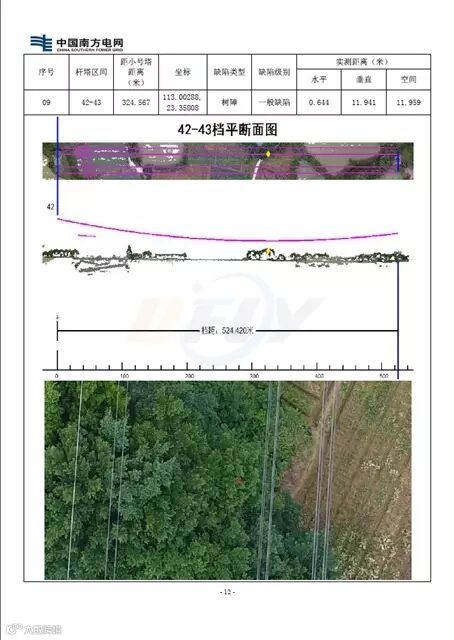 树障分析软件结合无人机数据的空三成果,通过在无人机高清影像半自动均匀量测线路下导线的少量同名点,由同名点根据悬列线公式拟合出电力线轨迹。同时对点云数据进行分类,区分出地面与地表。以此可准确计算量取电力线距离地面和地表的准确距离。最后自动进行危险分析,对危险点进行突出显示,并自动输出实时工况树障危险点分析报告。