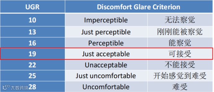 眩光如何评价呢?CIE在综合各国眩光计算公式的基础上提出了统一眩光值(UGR)计算公式。当UGR值小于19时,其眩光程度为人眼可接受程度。因此对于室内灯具而言,UGR19为室内照明的眩光评价指标。