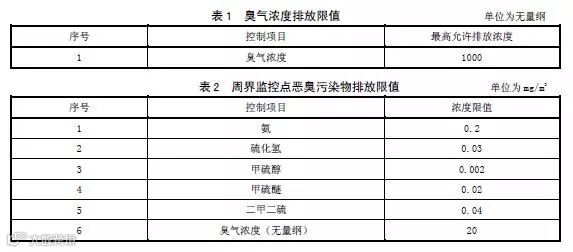 4.2 有组织排放源(渗滤液处理设施排气筒)臭气浓度排放限值应符合表1中的规定,周界监控点恶臭污染物排放限值应符合表2中的规定。