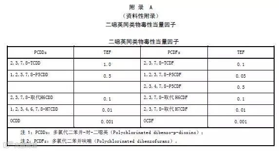 二噁英类毒性当量因子(TEF)是二噁英类毒性同类物与2,3,7,8-四氯代二苯并-对-二噁英对Ah受体的亲和性能之比。二噁英同类物毒性当量因子表参见附录A。
