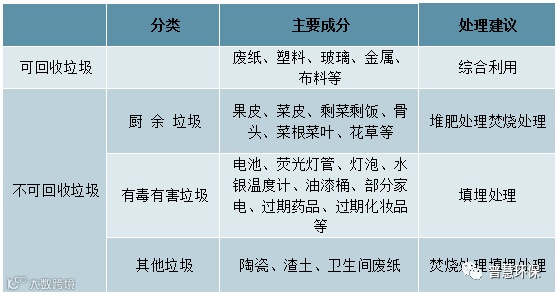 垃圾分类产业链可以分为三个环节:上游是居民垃圾分类,主要分为湿垃圾、干垃圾、可回收垃圾、有害垃圾等;中游是环卫,包括垃圾分类、垃圾收运和垃圾转运三个环节;下游是垃圾处置,包括焚烧、填埋、堆肥和回收利用。