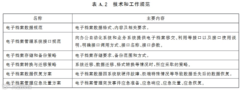 技术和工作规范名称及主要内容宜参照附录A的表A.2制定。技术和工作规范应协调配合,明确电子档案数据规范、电子档案管理系统接口规范、电子档案存储和备份策略、电子档案转换与迁移策略、电子档案数据恢复方案、电子档案管理应急处置方案。