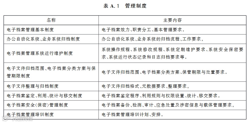 管理制度名称及主要内容宜参照附录A的表A.1制定。管理制度应规定或明确电子档案效力和各部门职责分工,办公自动化系统、业务系统、电子档案管理系统管理流程和运行维护要求,电子文件归档范围,电子档案分类方案与保管期限表,电子文件整理、归档要求,电子档案鉴定、利用、统计与移交要求,电子档案安全(保密)管理要求,电子档案 管理培训要求等。管理制度可以根据需要单独或合并制定。