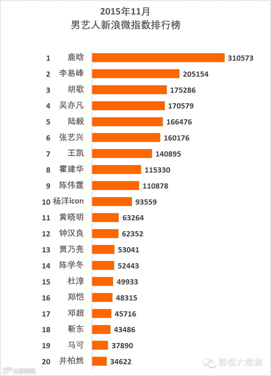 前20名是:鹿晗、李易峰、胡歌、吴亦凡、陆毅、张艺兴、王凯、霍建华、陈伟霆、杨洋icon、黄晓明、钟汉良、贾乃亮、陈学冬、杜淳、郑恺、邓超、靳东、马可、井柏然。