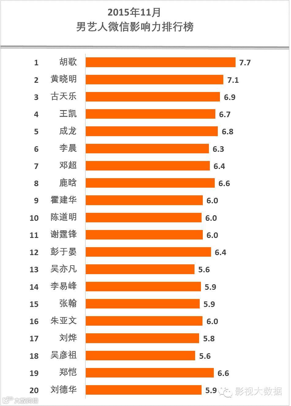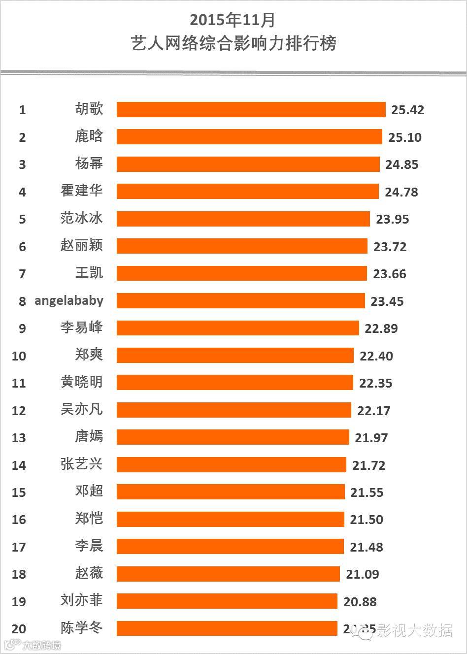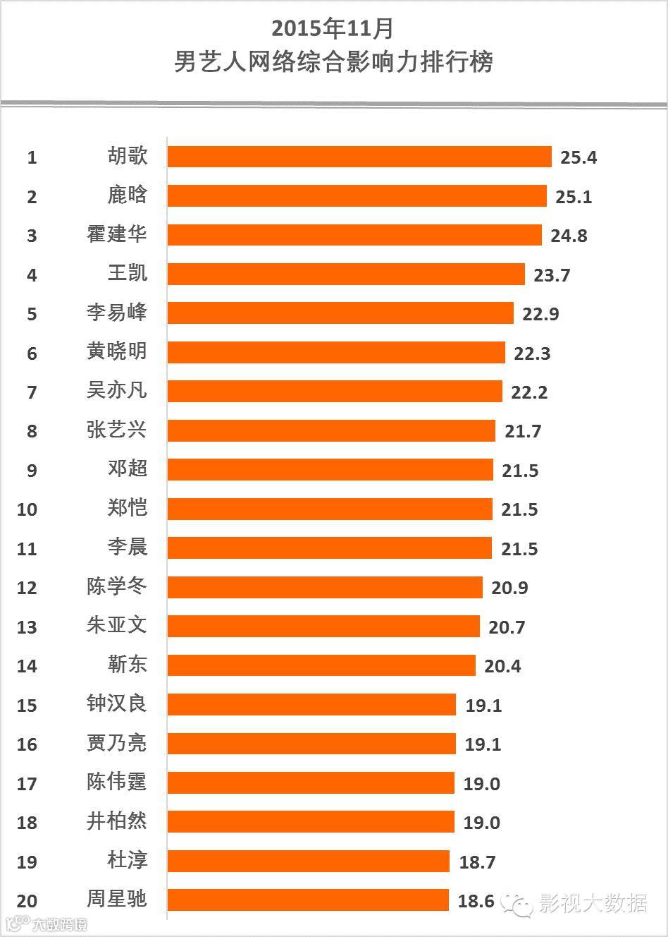胡歌、鹿晗、杨幂、霍建华、范冰冰、赵丽颖、王凯、angelababy、李易峰、郑爽、黄晓明、吴亦凡、唐嫣、张艺兴、邓超、郑恺、李晨、赵薇、刘亦菲、陈学冬名列艺人综合影响力前20名。