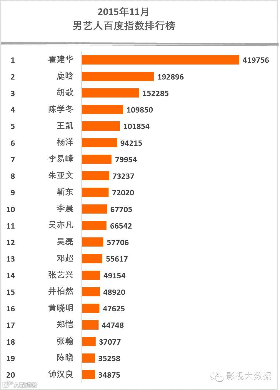 前20名是:霍建华、鹿晗、胡歌、陈学冬、王凯、杨洋、李易峰、朱亚文、靳东、李晨、吴亦凡、吴磊、邓超、张艺兴、井柏然、黄晓明、郑恺、张翰、陈晓、钟汉良。