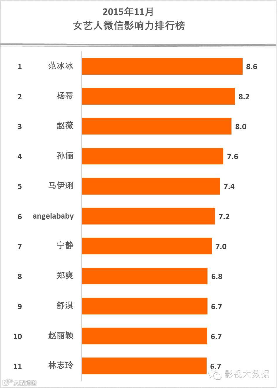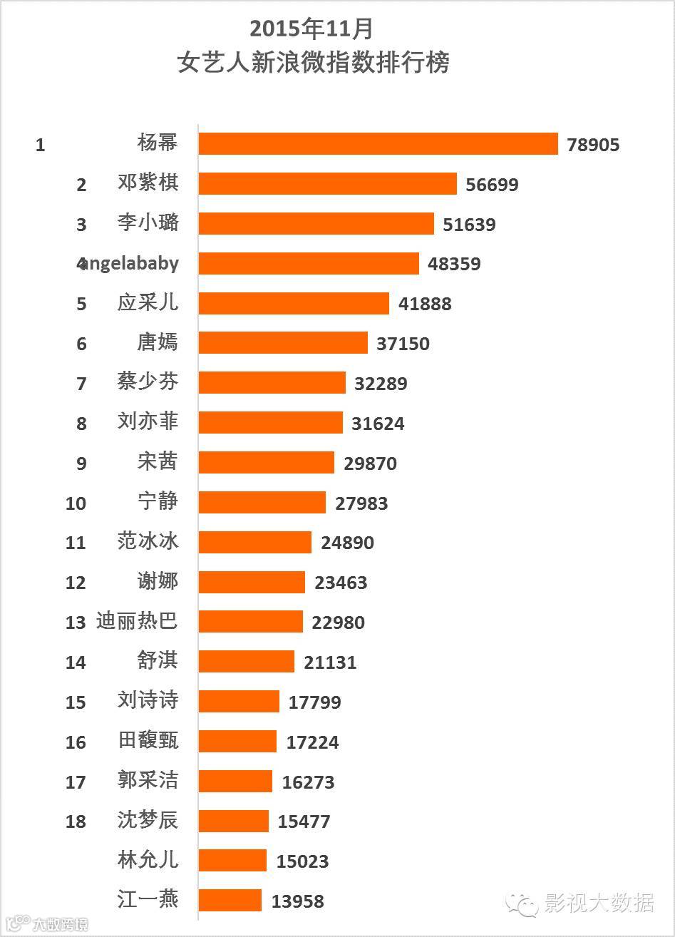 前20名是,范冰冰、杨幂、赵薇、孙俪、马伊琍、angelababy、宁静、郑爽、舒淇、赵丽颖、林志玲、高圆圆、周迅、李冰冰、张柏芝、谢娜、赵雅芝、林心如、昆凌、唐嫣。