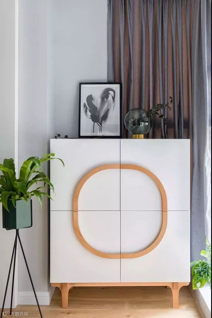 客厅以木色、白色、浅灰色为主色调,小面积点缀低饱和度的自然系色彩。朴素的材质,搭配绿植图案,整个空间显得更加简单舒适,又不乏温情。