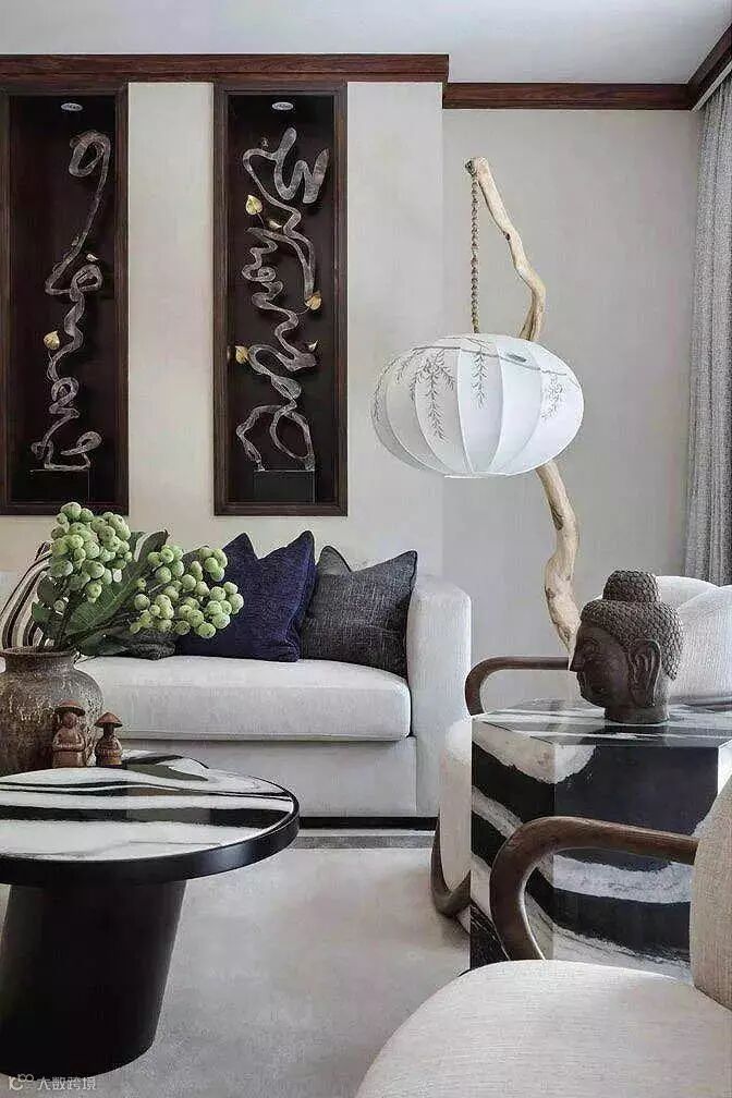 禅意的营造多从色彩、装饰物等多角度入手进行,古色古香的家具、古朴的雕花、竹制的窗帘、纯白的佛头等.这些具有传统特色的符号,直接铺陈出浓浓的禅意和佛性。
