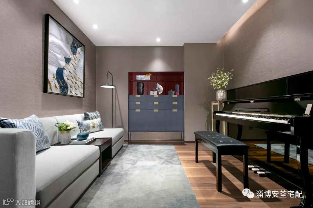 家庭厅的设计简雅大方,浅灰、木棕与湖蓝色互映搭配,现代家具的简约品相与饰品上装点的中式文韵交织相融,呈现空间丰盈且极致的内在精神。