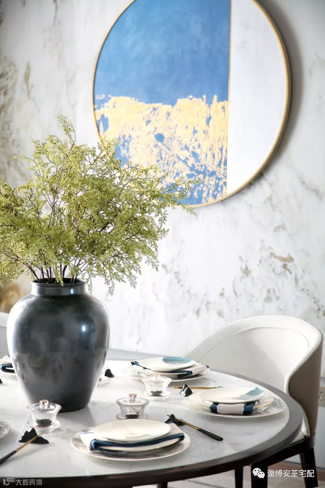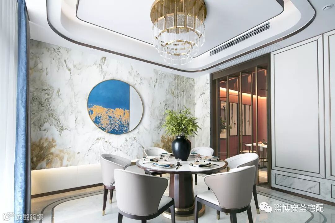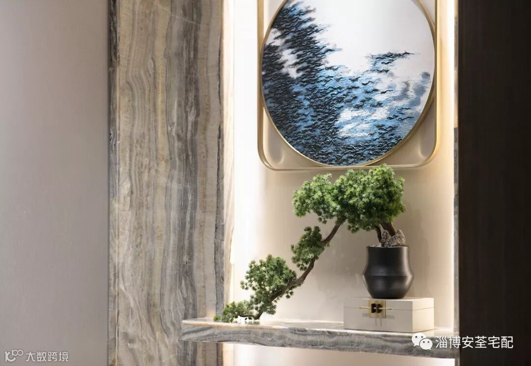 入户玄关,开门见山。大理石流动着的纹理,仿似在诉说着“一水护田将绿绕,两山排闼送青来。”
