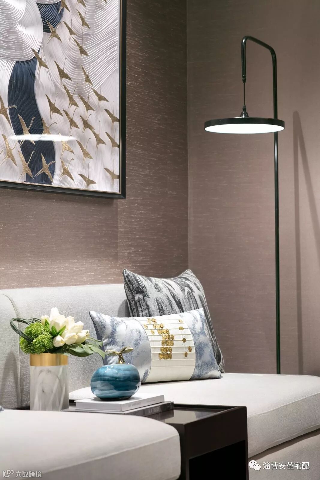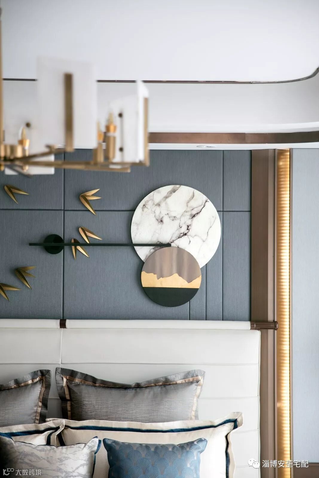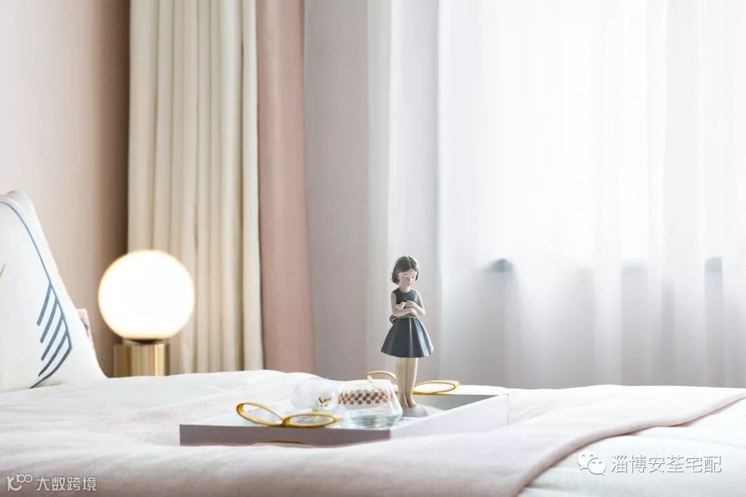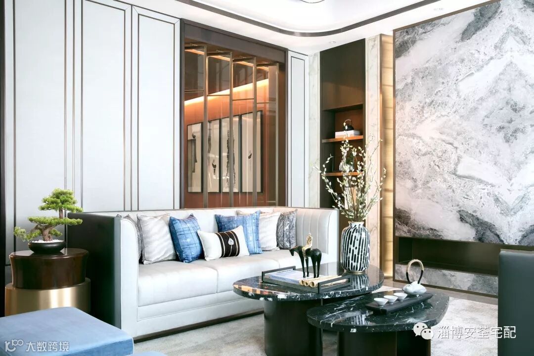 水纹的柔美点染于抱枕、地毯上,材质舒适而温婉。石材茶几加以精巧绝美饰品的轻微点缀,让空间在质朴雅致的意境中又提炼出一丝丝的当代气质与空间契合。