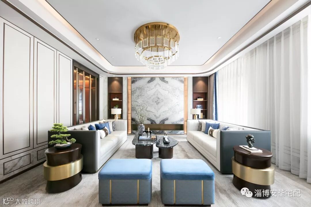 会客厅处处透露着对东方清雅生活意境的美好追求。汲取了水乡的湖蓝色,清雅的色调与现代简约形制融构于一体,在空间中铺陈出别有风致的现代中式美学意涵。