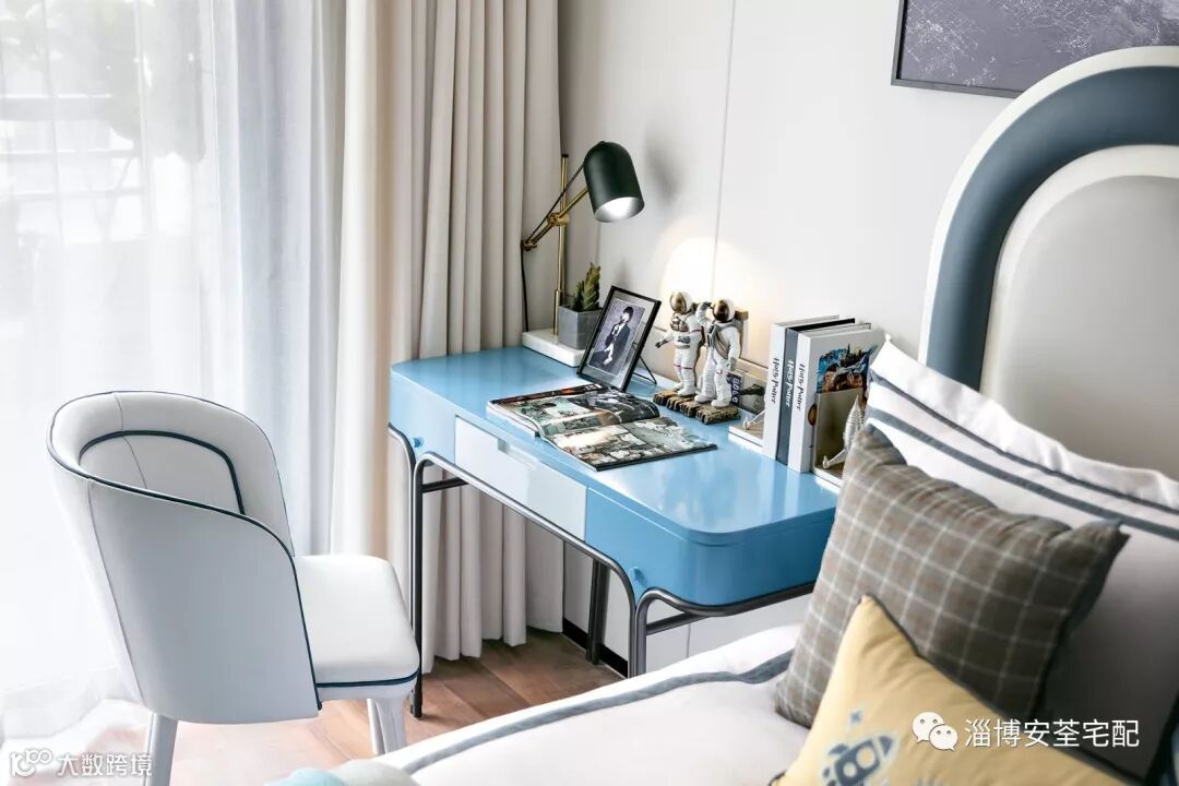 走入老人房,一派“鎏金岁月”光景,宁静素雅的空间调性中运用了高贵金与黛蓝色注入活力,胡桃木饰面的沉稳、丝质软包的优雅、古典瓷器的温润,在艺术中沉淀生活的品位。