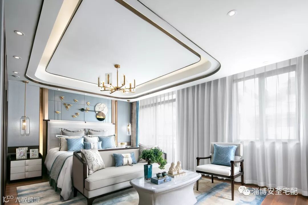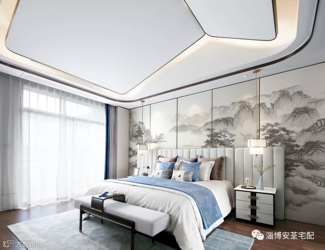背景墙采用山水人文画作,浓郁的书香气息,突显温润质感。简雅大方的家具,中式纹样的床品,深灰与湖蓝的互映搭配,现代设计与东方文化的交织相融,品质承袭,色泽典雅。